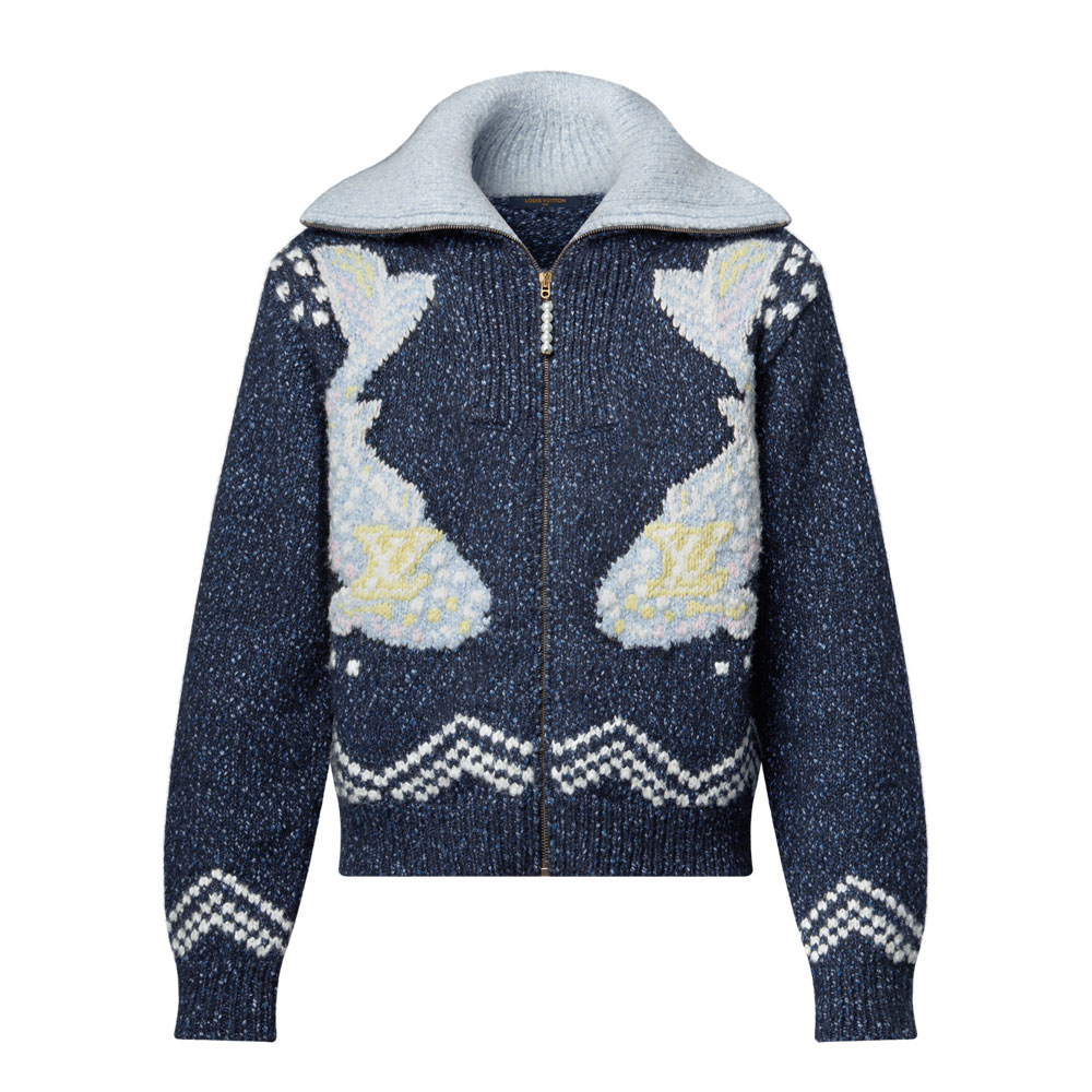 The front displays two signature LV koi fish, while the back reveals delicate cherry blossom motifs with elegant Japanese script. A refined pearl-accented zipper completes this fashionable jacket.