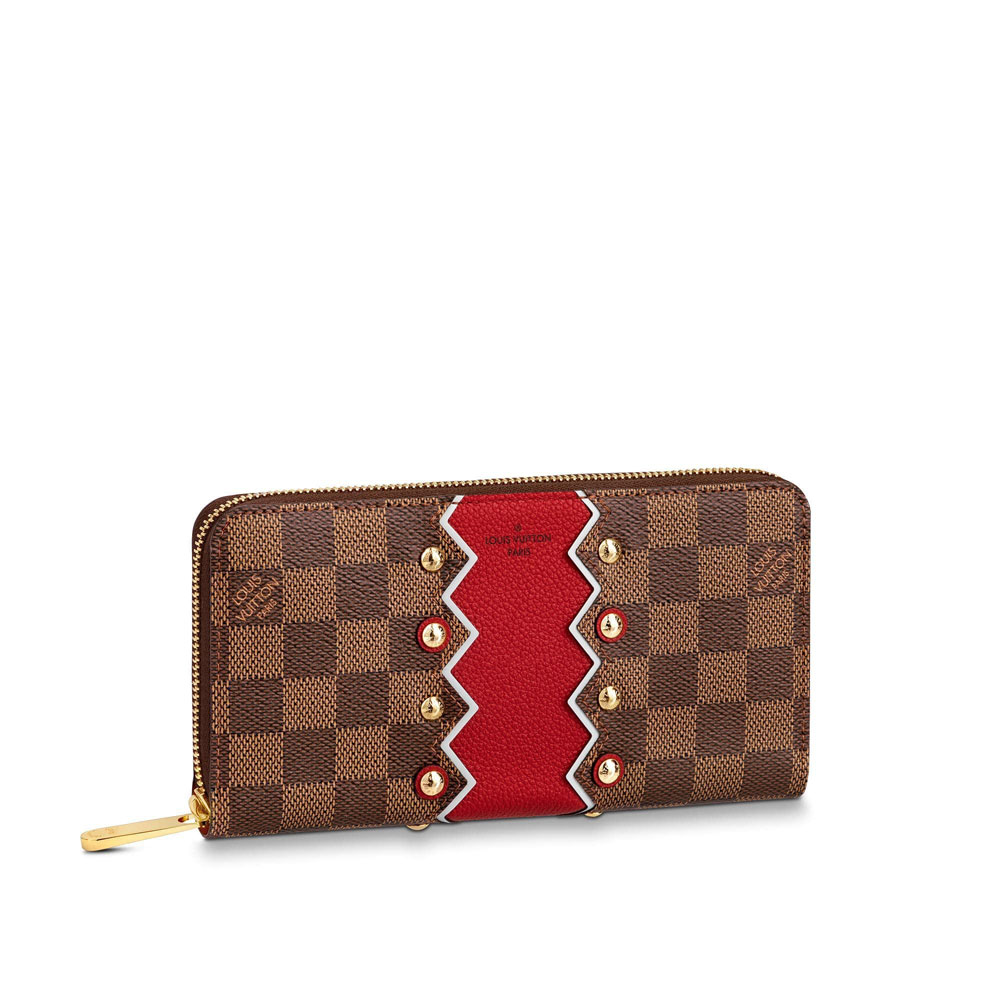 Louis Vuitton's historic Karakoram pattern comes to the Zippy Wallet for Winter 2018. Ruby-red and luminous-white grained cow leathers come together with engraved gold-finish studs in a bold motif that energizes this emblematic wallet.