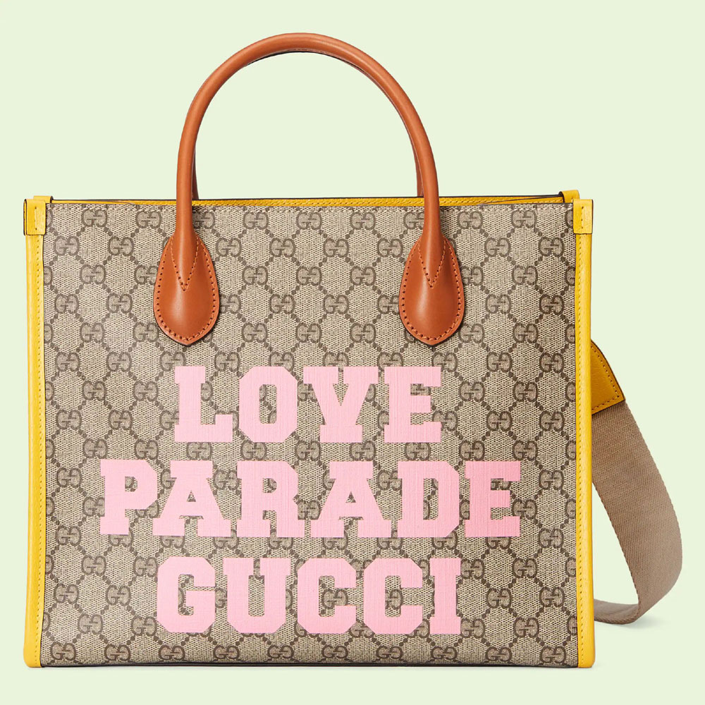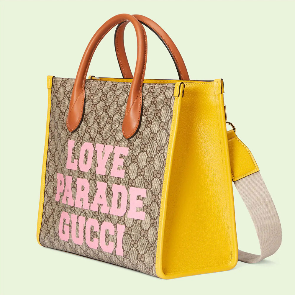 Reflecting the essence of the runway show. a 'Love Parade Gucci' print decorates this square-shaped tote bag. echoing the same joyful and playful narrative seen running through the collection. A brown and yellow leather trim adds a pop of color against the signature GG Supreme canvas.