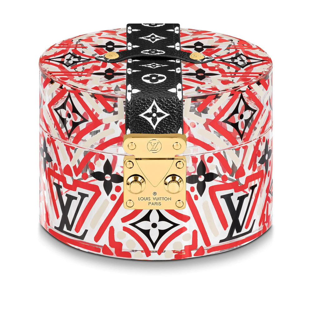 The decorative pattern on the LV Crafty Scott box is inspired by the Aboriginal masks in Gaston Louis's private collection. Crafted from transparent plexiglass with canvas detailing. This item is an innovative upgrade of the House's emblematic Boite Scott case. An LV Circle and iconic S-lock closure complete this vibrant accessory. 5.5 x 3.5 x 4.9 inches 5.5 x 4.9 x 3.5 inches/14 x 12.5 x 9 cm Red Gold-color hardware Plexiglas Canvas Gold-color hardware Allover LV Crafty print LV Circle S-lock closure