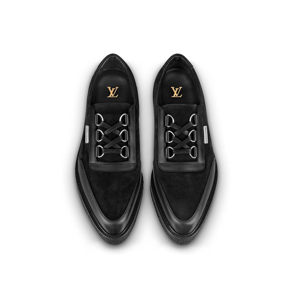 Derby in suede calf leather. with pointy toe and metallic Louis Vuitton signature. Seen on the Spring Summer 2019 show.