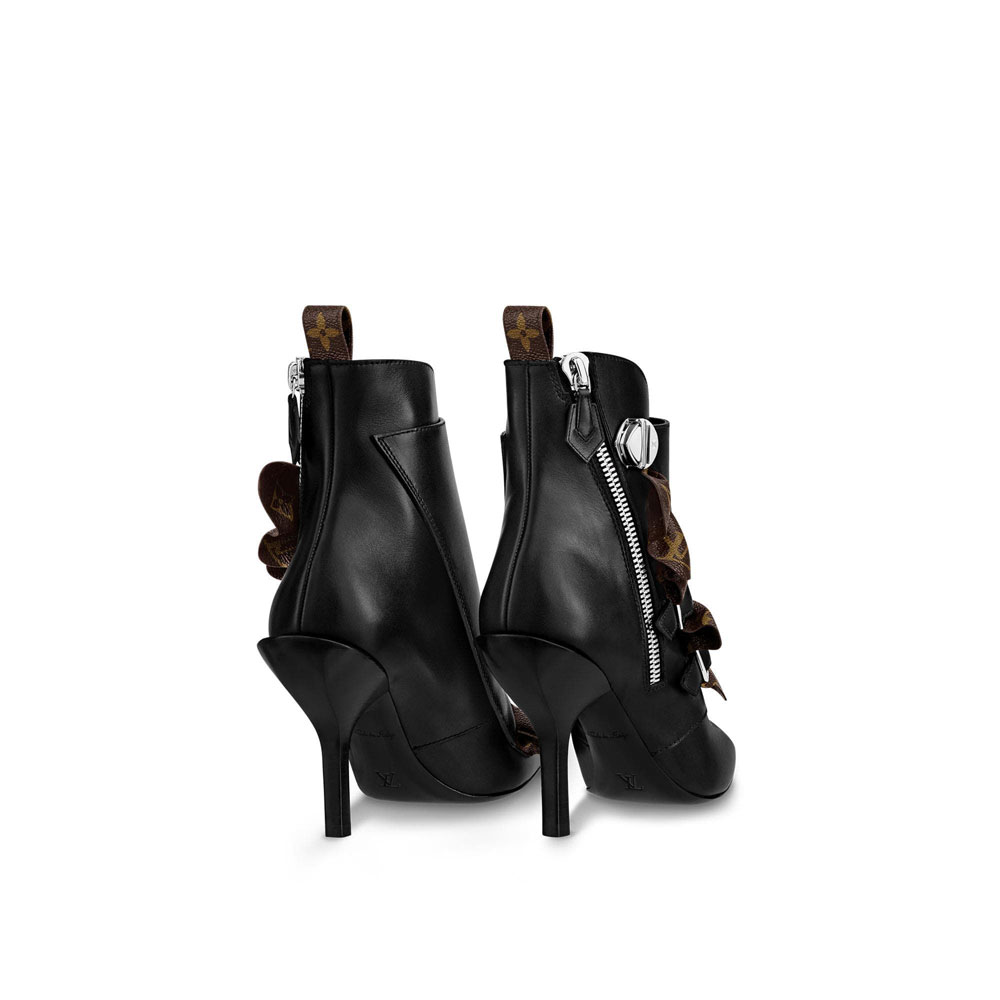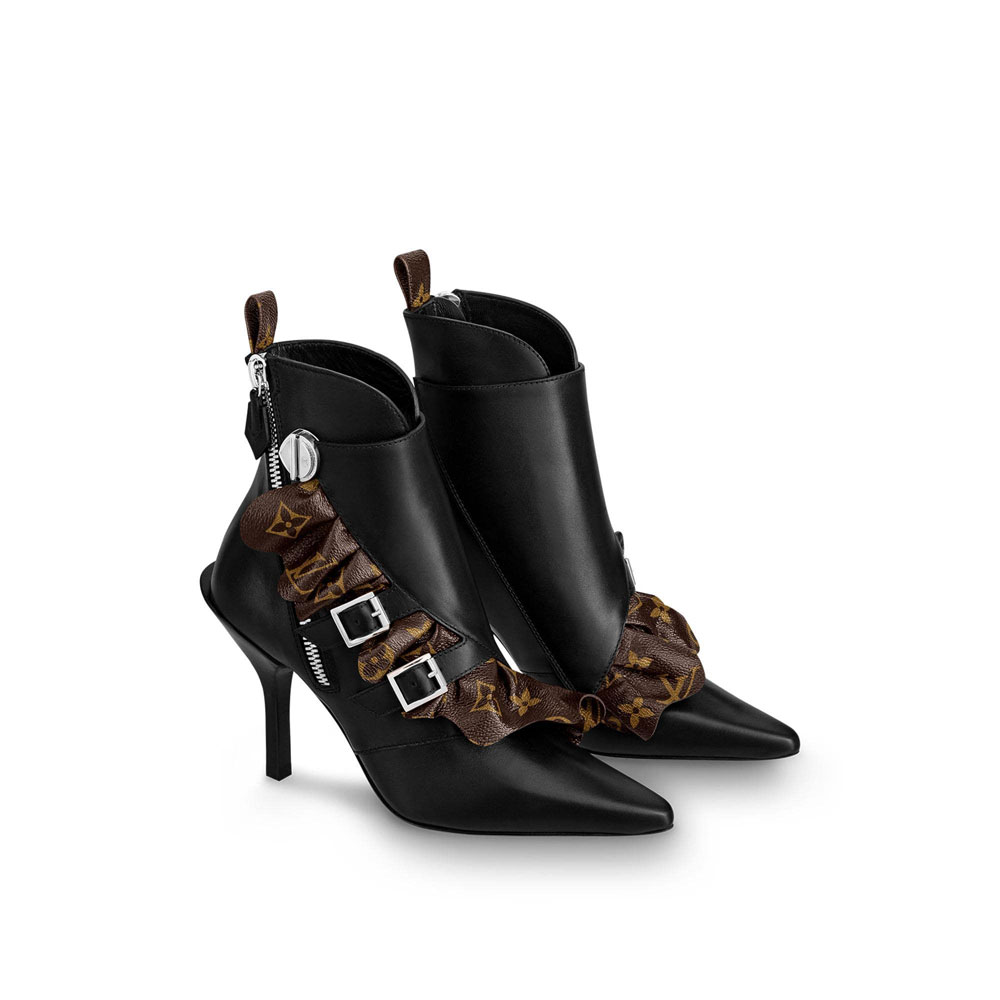 The Janet ankle boot combines black calf leather with a ruffle in Louis Vuitton's iconic Monogram canvas. One of the key looks of the Spring-Summer 2019 fashion show. this assertive. feminine style is distinguished by its angular silver-tone buckles. LV-engraved closure. pointed toe and shifted-back stiletto heel.