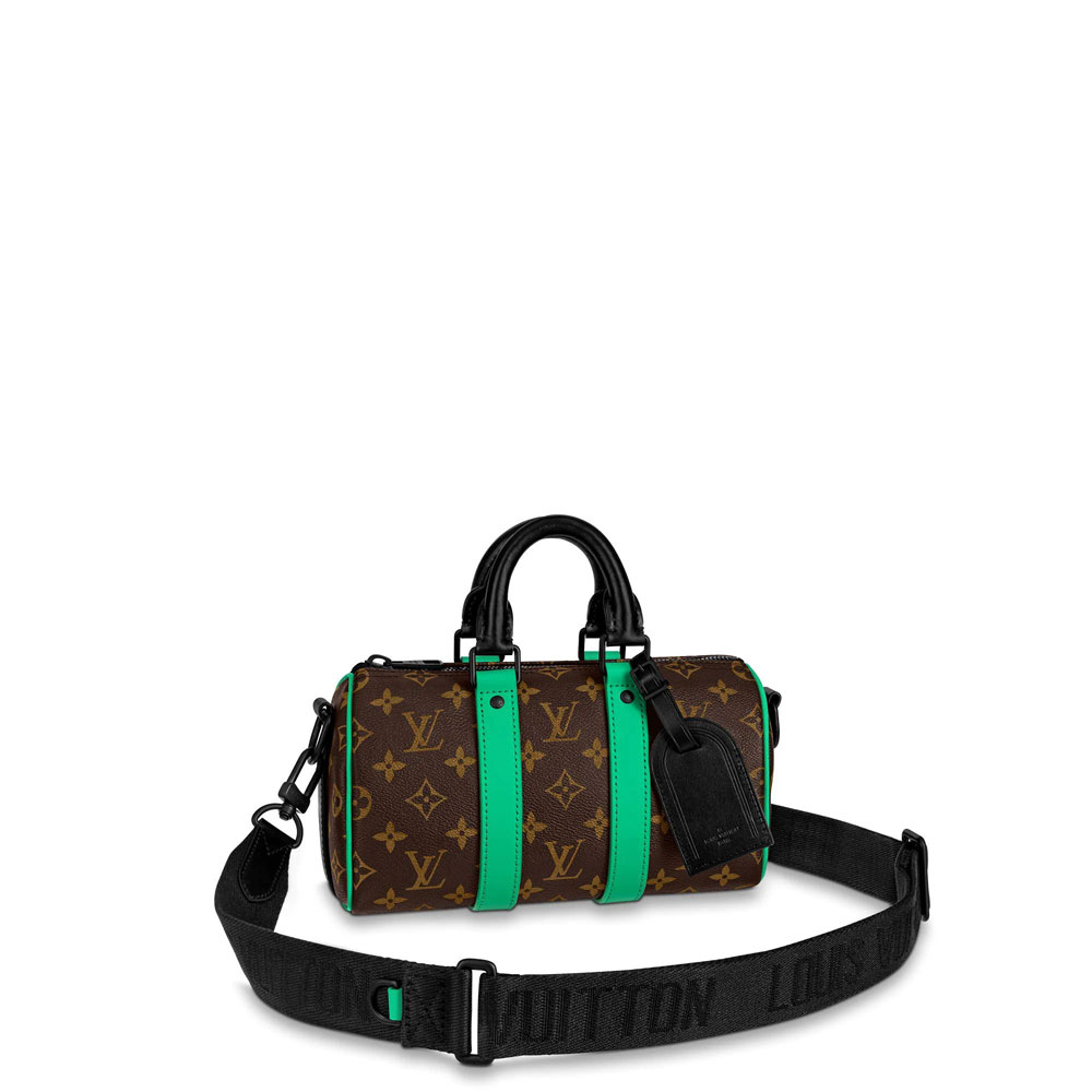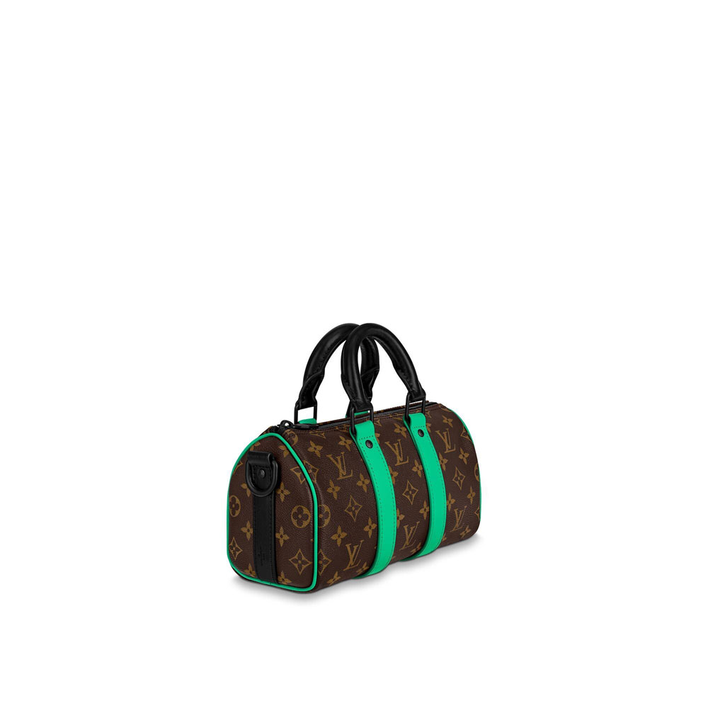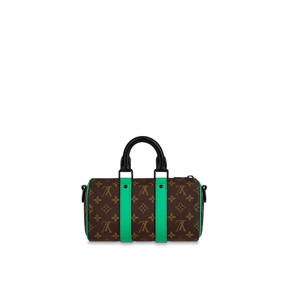 This new mini-version of the classic Keepall is styled in Monogram Macassar canvas trimmed with cowhide dyed bright Minty Green. one of designer Virgil Abloh's signature colors. Its updated design integrates all the iconic Keepall details. like the dual reinforcement strips and leather name tag. With its double handle and removable strap. it's a practical and eye-catching city bag.