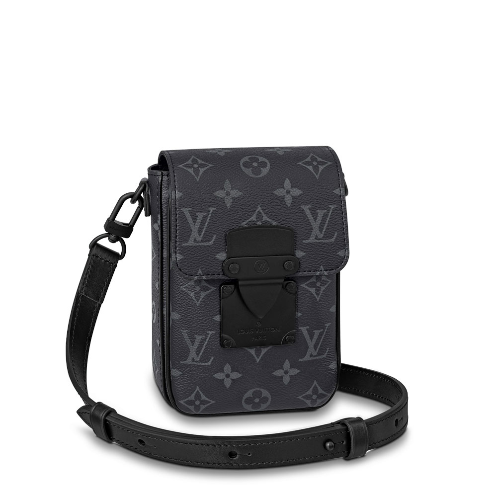 This S-Lock Vertical Wearable Wallet in Monogram Eclipse canvas is a great way to carrying everyday essentials. Inspired by the locks on Louis Vuitton's historic trunks. the S-lock magnetic closure keeps belongings secure. The removable and adjustable strap enables cross-body and shoulder carry. Inside there's a special compartment for a smartphone.