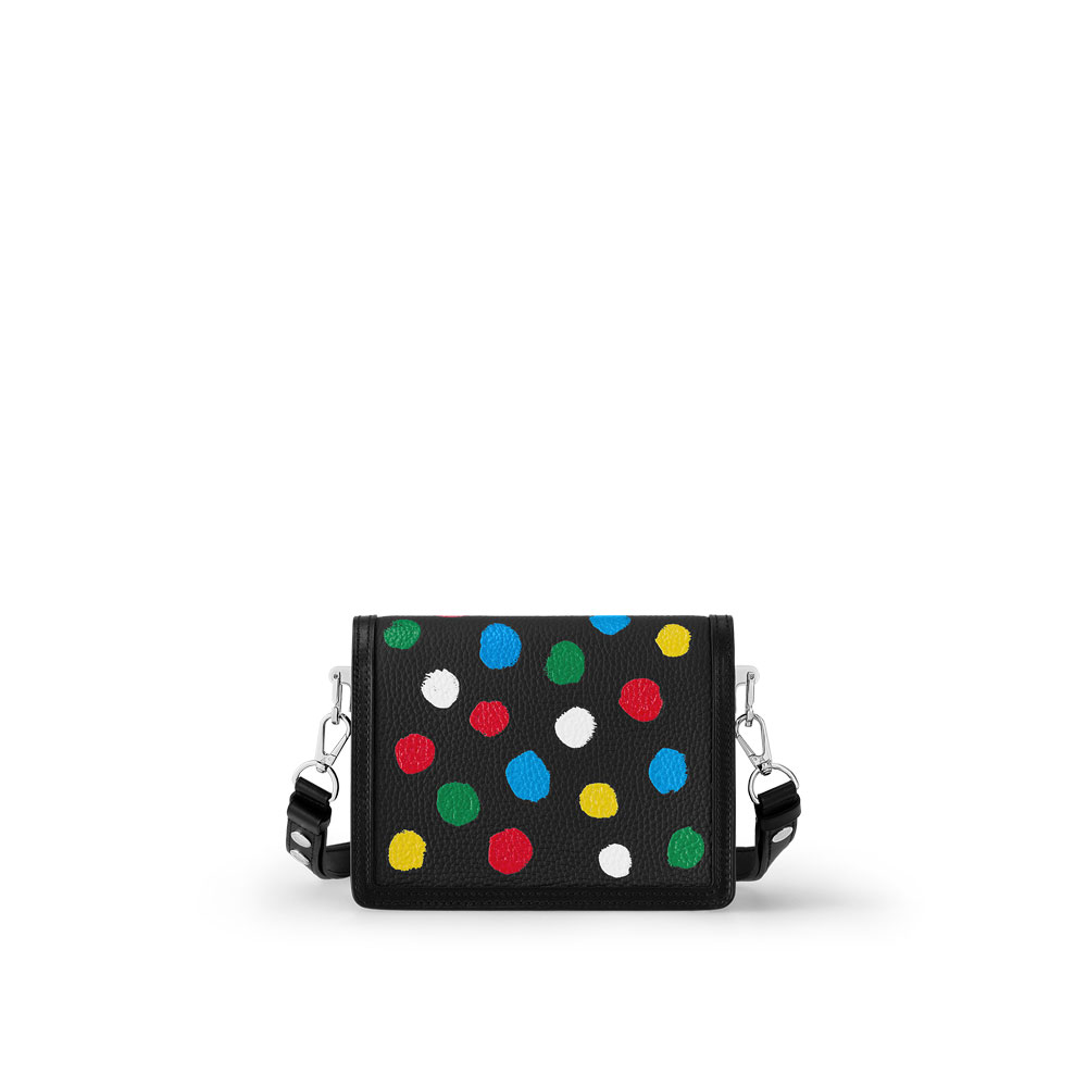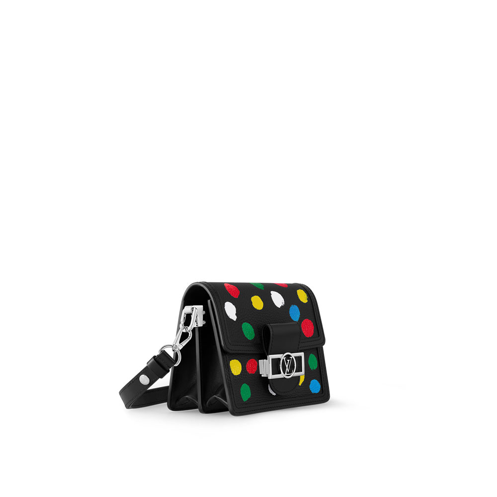 Created for the new Louis Vuitton x Yayoi Kusama collaboration. the LVxYK Dauphine Mini comes bedecked with a constellation of dots. a recurring theme in the acclaimed Japanese artist's work. Styled after the colorful dots that Kusama hand-painted on a trunk a decade ago after her first partnership with the House. the pattern is screen-printed on black Taurillon leather using a sophisticated technique that produces a 3D relief effect.
