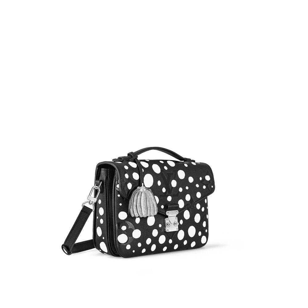 The LVxYK Pochette Metis pays homage to the work of a world-class artist as part of the second Louis Vuitton x Yayoi Kusama collection. Kusama's thematic dots. a unifying element in her paintings. sculptures and installations. are interpreted in white on black cowhide embossed with the House's heritage Monogram pattern. This elegant clutch is accented with a charm shaped like a pumpkin - another of the revered artist's signature images.