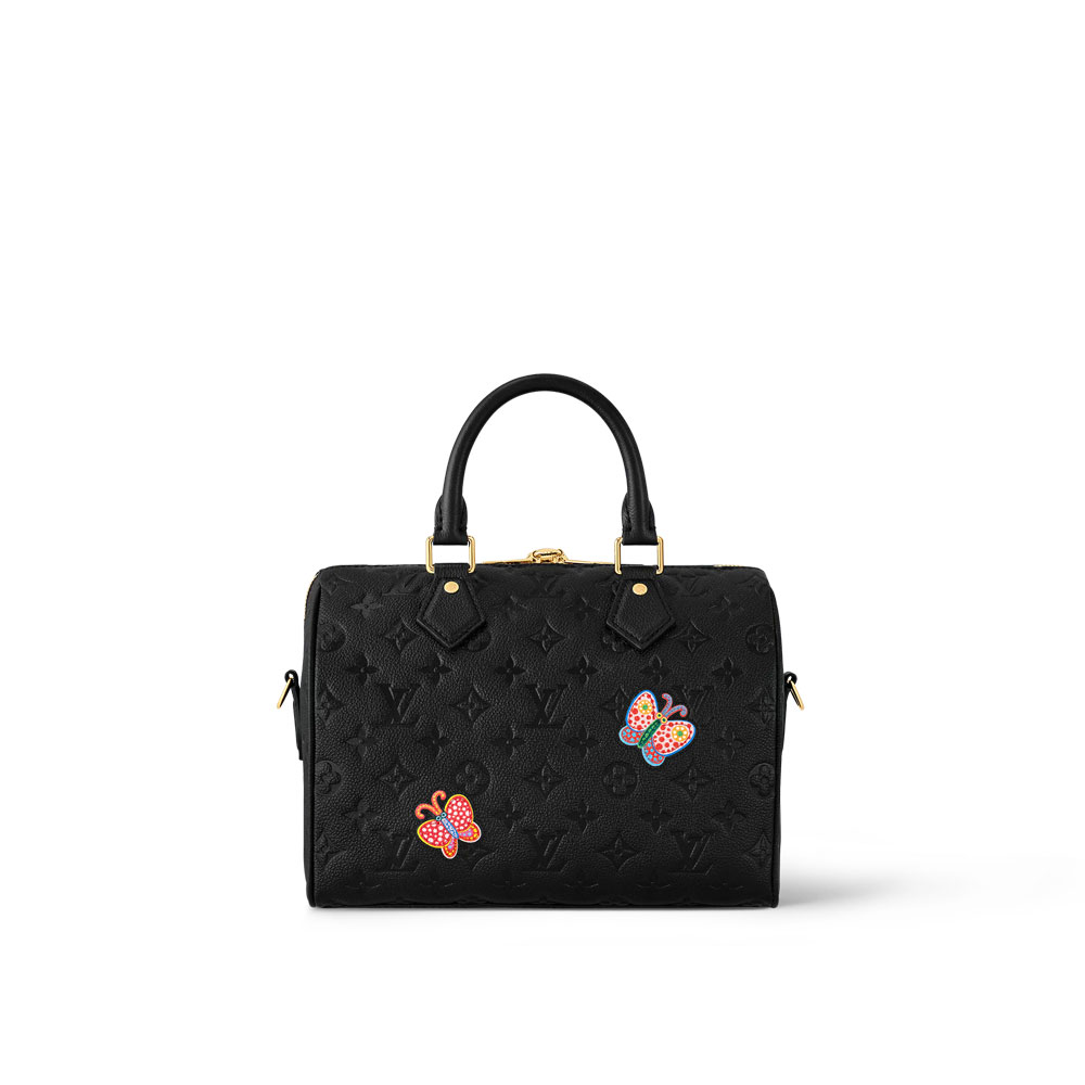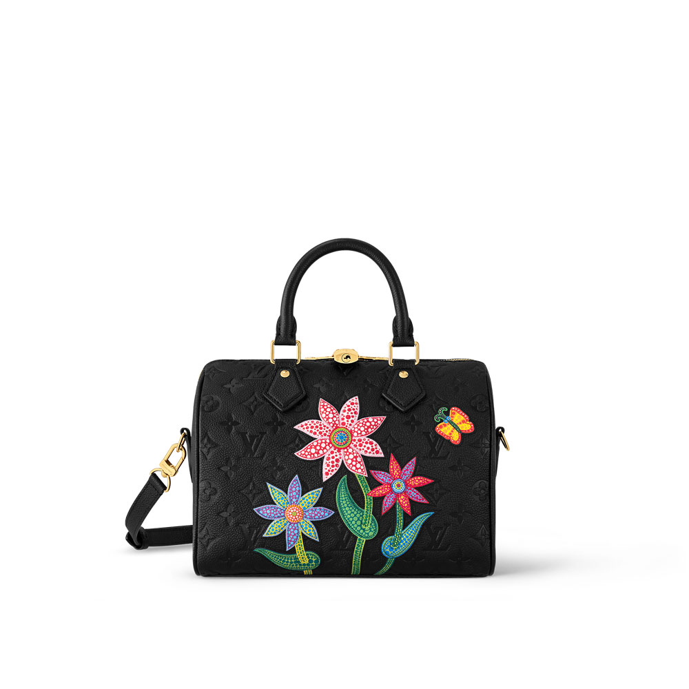 For the Louis Vuitton x Yayoi Kusama collection. the LVxYK Speedy Bandouliere 25 comes adorned with three colorful flowers and a butterfly. Flowers have been a key element in the artist's life and work since her childhood in rural Japan. where her parents ran a plant nursery. Here they appear in leather marquetry on black Monogram Empreinte cowhide. giving this stylish bag a distinctively feminine crafted touch.