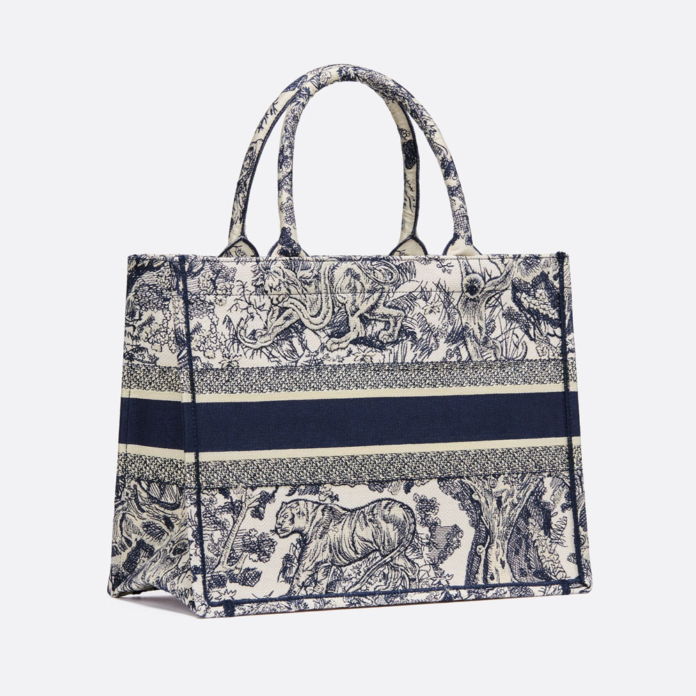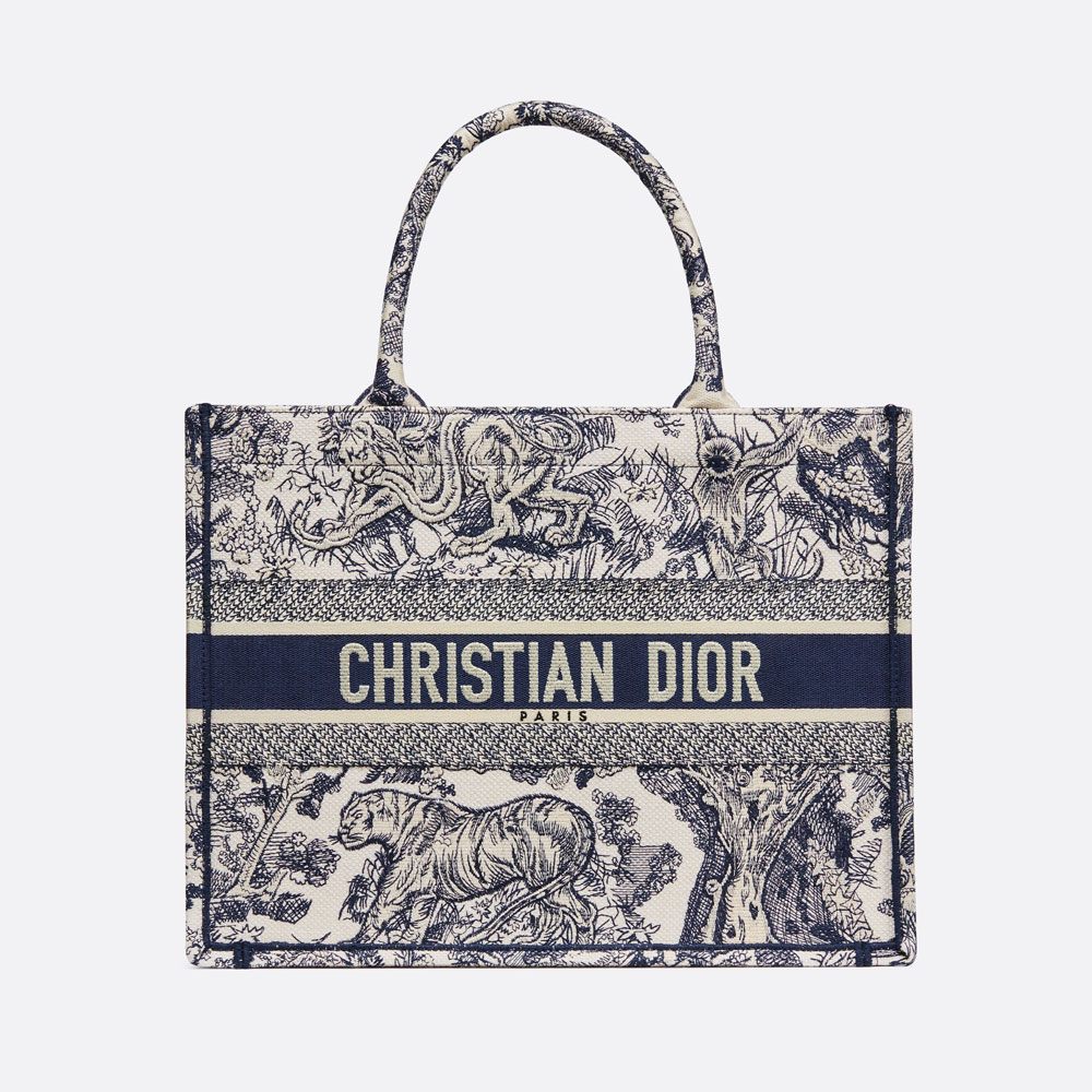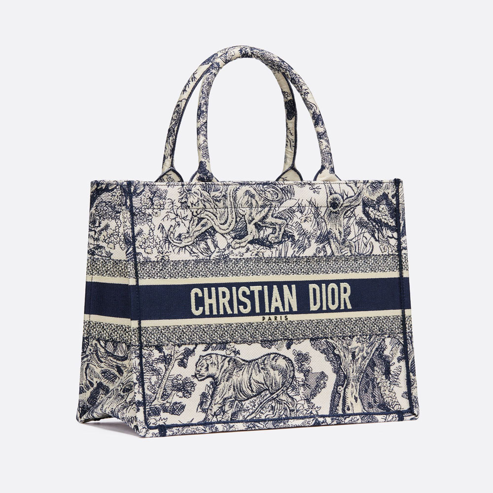 Introduced by Maria Grazia Chiuri. Creative Director of Christian Dior. the Dior Book Tote has become a staple of the Dior aesthetic. Designed to hold all the daily essentials. the style is fully embroidered with a blue Toile de Jouy motif. Adorned with the 'CHRISTIAN DIOR PARIS' signature on the front. the medium tote exemplifies the House's signature savoir-faire and may be carried by hand or worn over the shoulder.