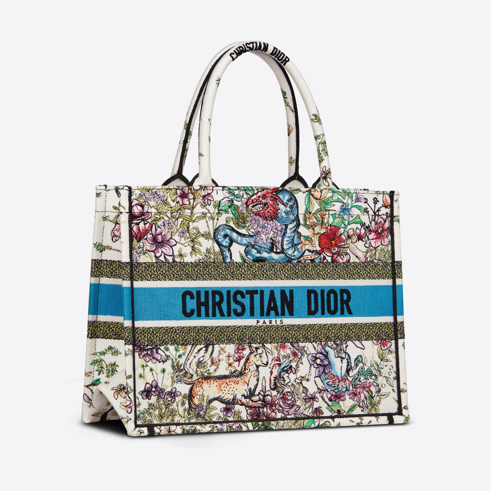 Introduced by Maria Grazia Chiuri. Creative Director of Christian Dior. the Dior Book Tote has become a staple of the Dior aesthetic. Designed to hold the daily essentials. the style is fully embroidered with a latte D-Constellation motif. embodying Mr. Dior's passion for astrology. Adorned with the 'CHRISTIAN DIOR PARIS' signature on the front. the medium tote exemplifies the House's signature savoir-faire and may be carried by hand or worn over the shoulder.