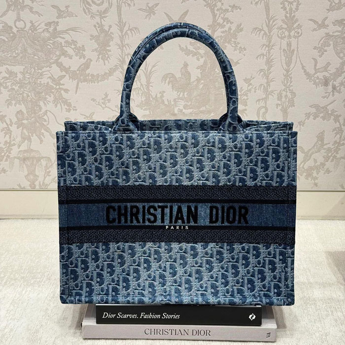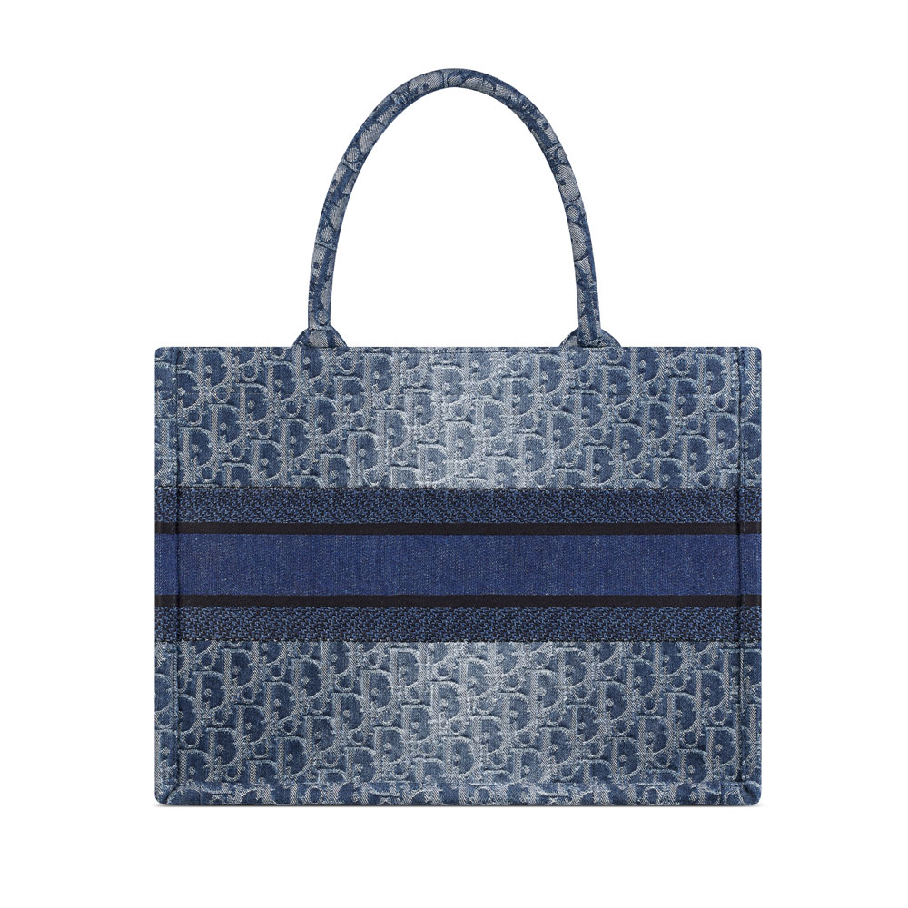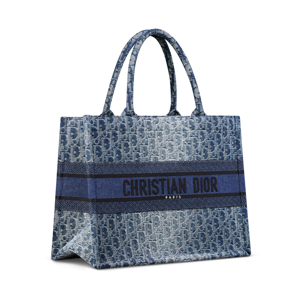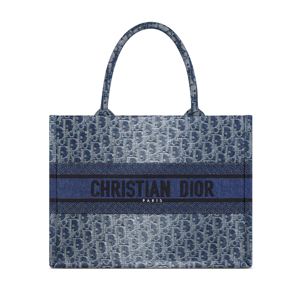 Crafted under Maria Grazia Chiuri's vision, the Dior Book Tote embodies the brand's artistic essence This versatile bag combines functionality with artisanal craftsmanship, featuring indigo Dior Oblique jacquard inspired by traditional stone-wash techniques Embellished with a bold emblem at the front, it showcases the maison's heritage through modern minimalism Designed for practical elegance, its structured silhouette adapts effortlessly from daytime errands to evening occasions.