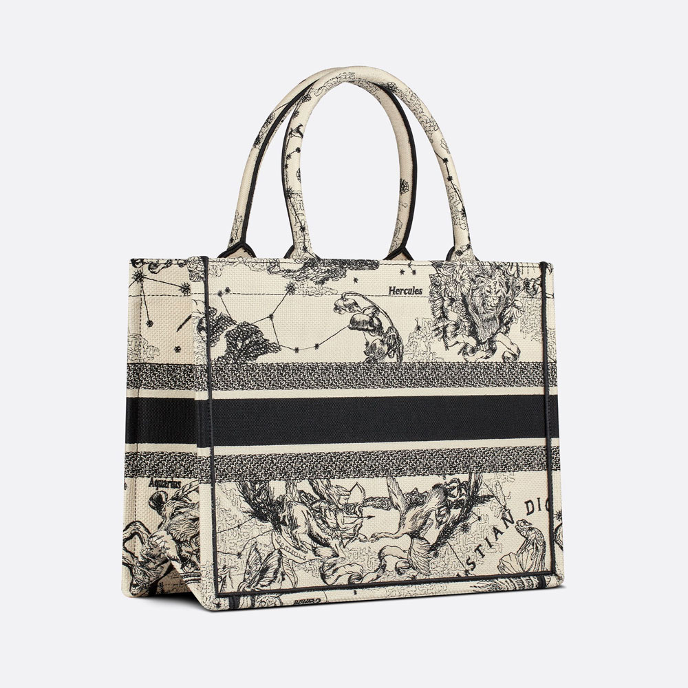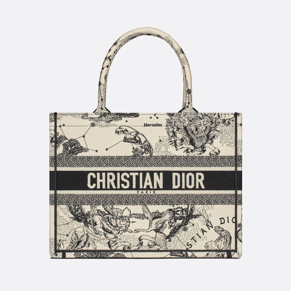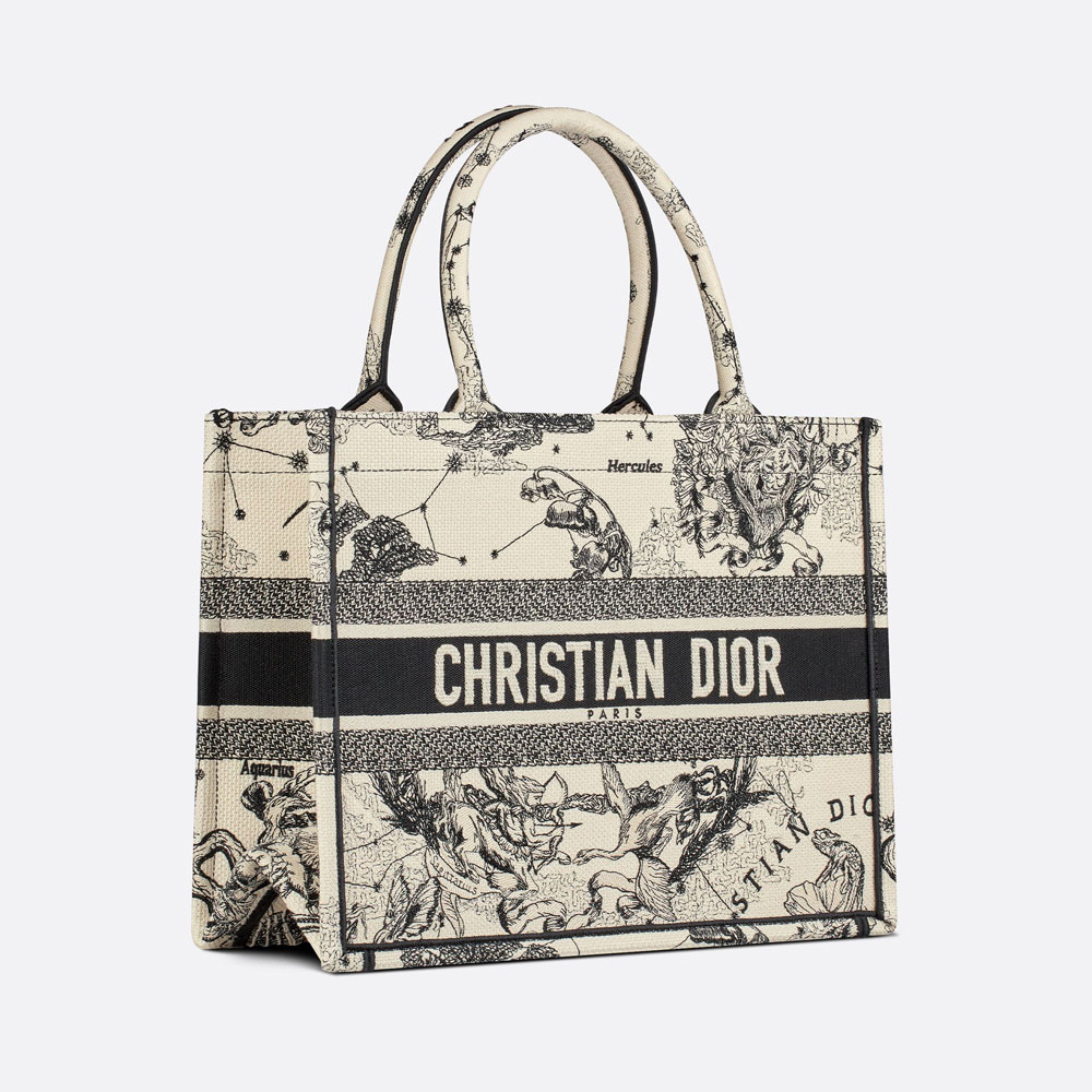Introduced by Maria Grazia Chiuri. Creative Director of Christian Dior. the Dior Book Tote has become a staple of the Dior aesthetic. Designed to hold all the daily essentials. the style is fully embroidered with the latte Dior Zodiac motif designed by the artist Pietro Ruffo. Adorned with the 'CHRISTIAN DIOR PARIS' signature on the front. the medium tote exemplifies the House's signature savoir-faire and may be carried by hand or worn over the shoulder.