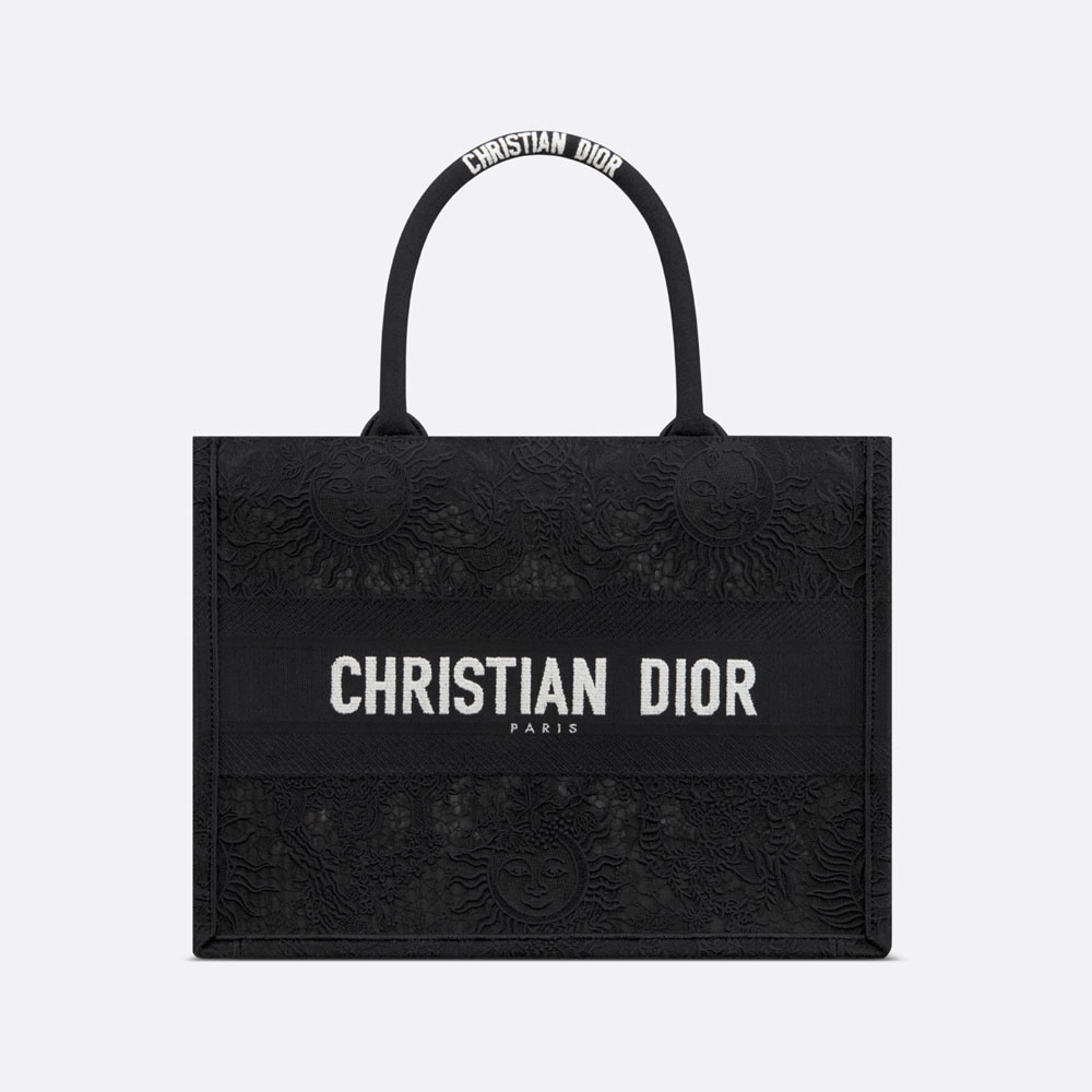 Introduced by Maria Grazia Chiuri, Creative Director of Christian Dior, the Dior Book Tote has become a staple of the Dior aesthetic. Designed to hold all the daily essentials, the style is fully embroidered with black Macrame offering a new take on the iconic House motif with the season's signature Toile de Jouy Soleil, layering suns and crescent moons into a floral design representing the four seasons. Exemplifying House savoir-faire, the medium tote is adorned with the Christian Dior Paris signature on the front, and may be carried by hand or worn over the shoulder.