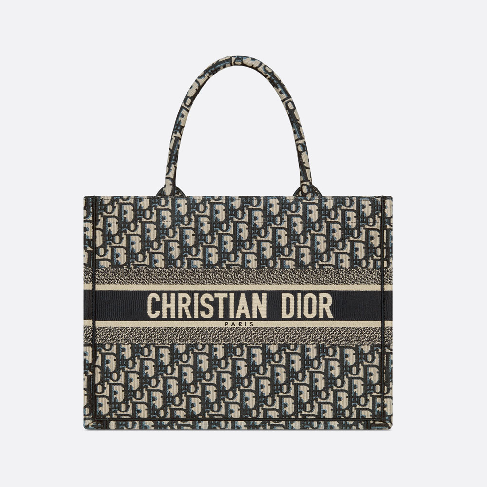 Introduced by Maria Grazia Chiuri, Creative Director of Christian Dior, the Dior Book Tote has become a staple of the Dior aesthetic. Designed to hold all the daily essentials, the style is fully embroidered with the ecru and blue Dior Oblique motif. Adorned with the Christian Dior Paris signature on the front, the medium tote exemplifies the House's signature savoir-faire and may be carried by hand or worn over the shoulder.