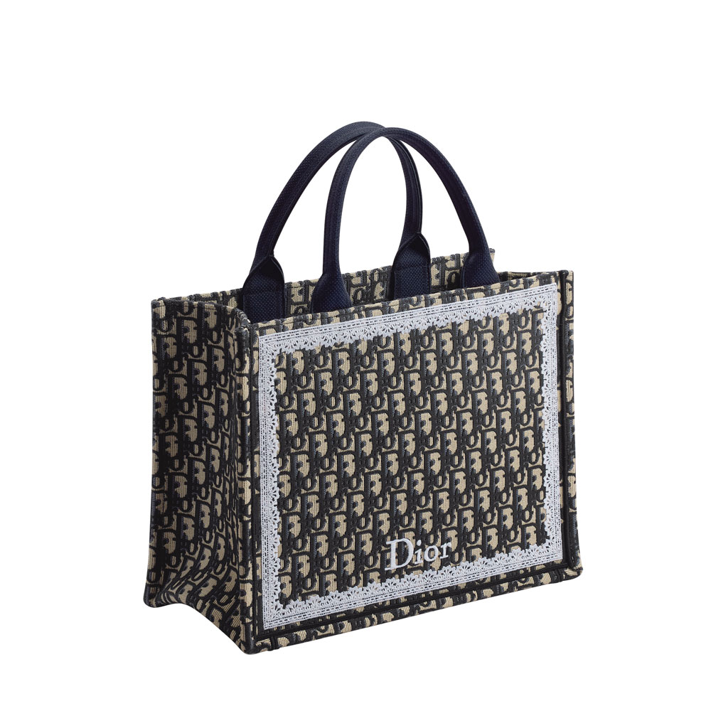 The elegant medium tote features Dior's iconic Oblique embroidery, framed with delicate lace. This modern interpretation of 18th-century luxury offers versatile carrying options.