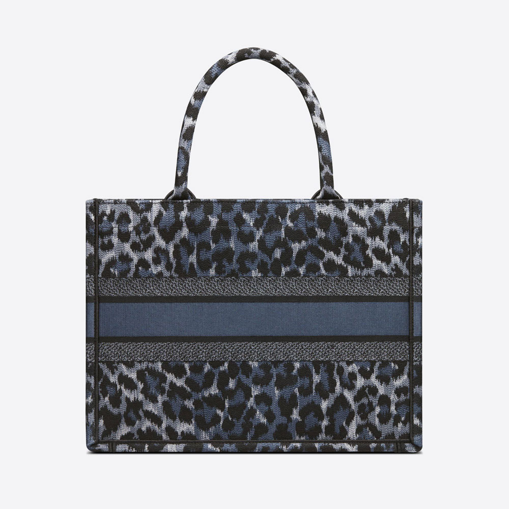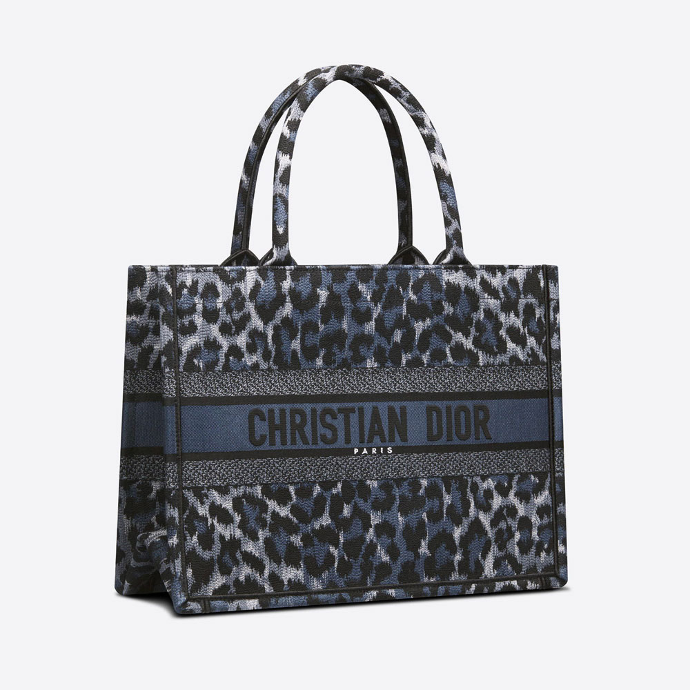Introduced by Maria Grazia Chiuri. Creative Director of Christian Dior. the Dior Book Tote has become a staple of the Dior aesthetic. Designed to hold the daily essentials. the style is fully embroidered with a blue and black Mizza motif. inspired by a leopard pattern from the House archives. The design is adorned with the 'CHRISTIAN DIOR PARIS' signature on the front and exemplifies the House's signature savoir-faire. The medium tote may be carried by hand or worn over the shoulder.