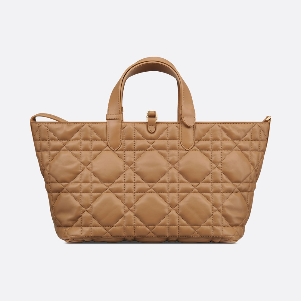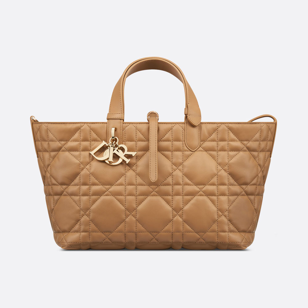 the Dior Toujours bag is distinguished by a casual and practical design. Crafted in medium tan calfskin with Macrocannage topstitching, it showcases a spacious interior compartment with a matching pouch to organize essentials. Its thin leather strap closure keeps items secure while the D of the CD Lock clasp twists to adjust the sides and enhance the bag's silhouette. The leather handles can be adjusted using the small notches in order to be able to carry the medium bag by hand or wear it over the shoulder.