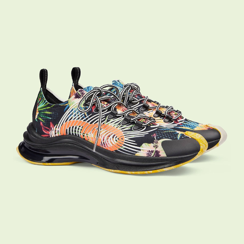 Activewear continues to lend inspiration to the Gucci narrative. Challenging the boundaries between day and night. formal and informal. hybrid styles bring together different worlds to create something new. The Gucci Run sneakers are presented in floral print technical knit fabric with logo details and a marble-effect sole. This item is part of Guccis MX. a selection that embraces freedom of expression and explores identity norms.