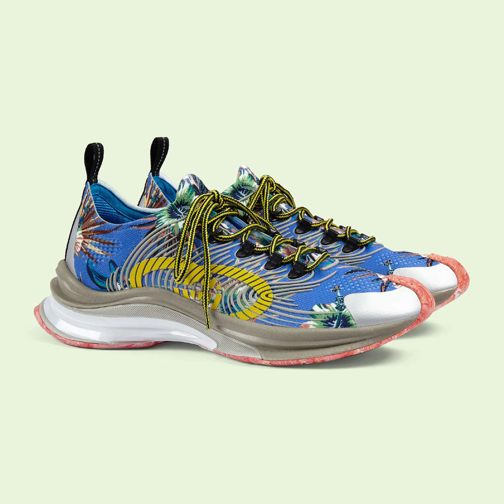 A colorful floral print and marble-effect sole lend a refined edge to this sports-inspired sneaker. Recalling fabrics used in the world of athletics. the Gucci Run is presented in technical knit fabric with bold logo details. The shoe is part of Guccis MX. a selection that embraces freedom of expression and explores identity norms.