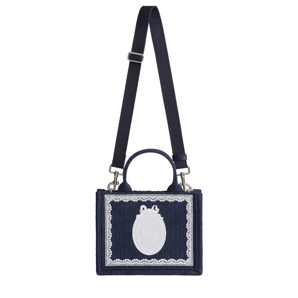 This exquisite mini tote reinterprets the classic Dior Book design with elegant Oblique jacquard and delicate lace accents. Featuring the iconic Dior Medaillon signature, it combines timeless luxury with contemporary charm.