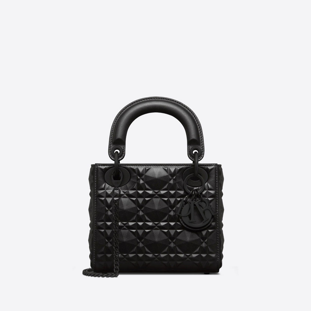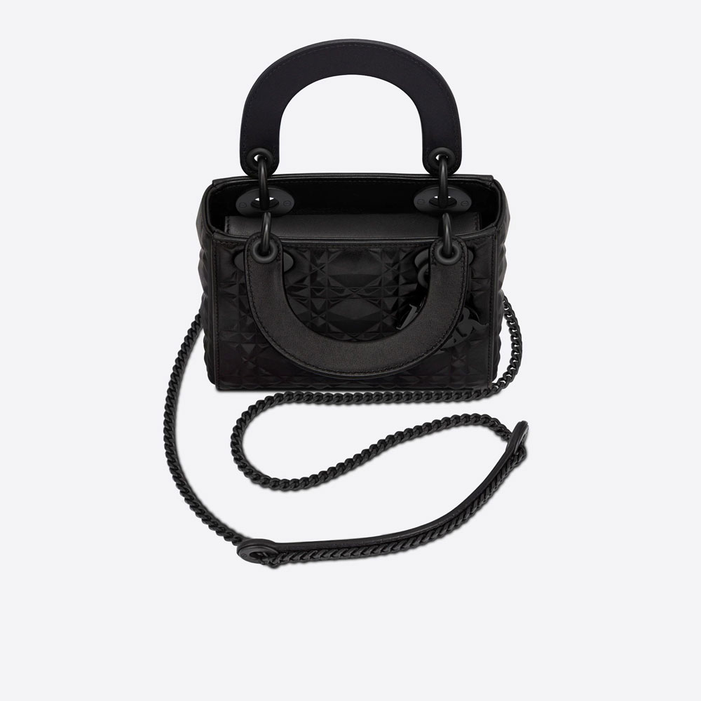 The Lady Dior bag epitomizes Dior's vision of elegance and beauty. Sleek and refined. the creation is timeless. Crafted in black Cannage calfskin. the bag showcases a graphic interpretation of the House's iconic motif. The tonal metal 'D.I.O.R.' charms offer an elegant allure. Featuring a removable chain shoulder strap. the miniature Lady Dior bag can be carried by hand or worn crossbody.