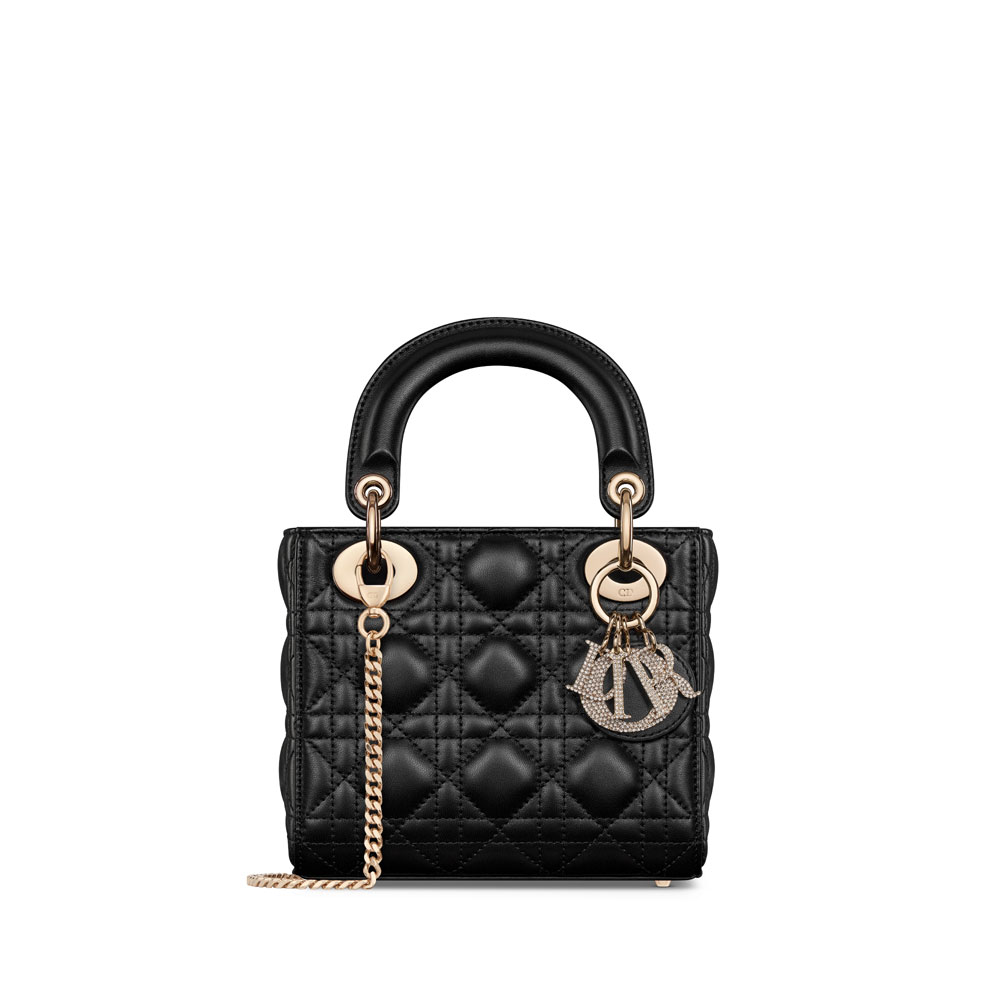 Sparkling D.I.O.R. charms highlight its shape, while black lambskin features quilted Cannage stitching.