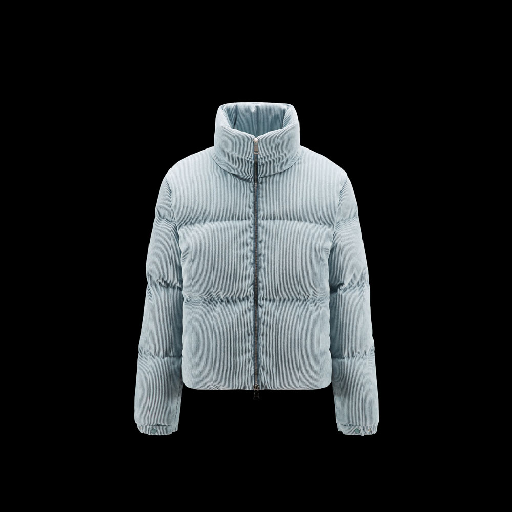 A classic Moncler shape. the Antre down jacket boasts a strong. voluminous silhouette. In an unexpected twist. the high-neck puffer jacket is crafted from corduroy. Featured in a powdery. ice cream-inspired colorway. the short down jacket completes early fall looks.