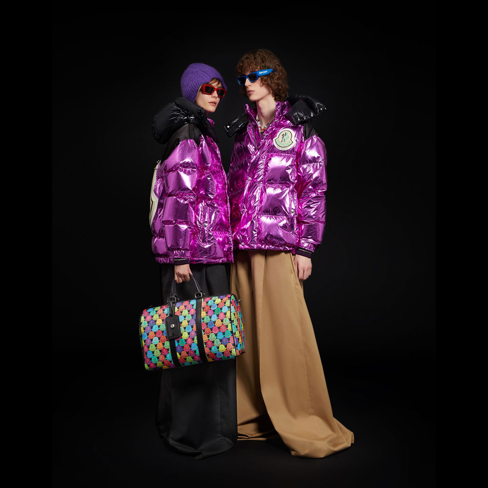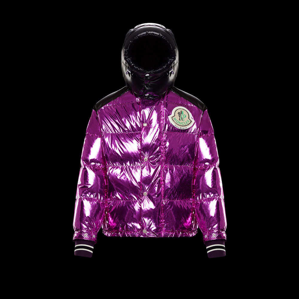 Down quilted mirror metallic nylon jacket A play of contrasts created with different tonal fabrics are delivered in this jacket from the 8 Moncler Palm Angels line collection n'8 of the Moncler Genius project. Mirror metallic nylon meets the satin detailed in the yoke while the focus is on the back of the garment where the Moncler macro-logo is accentuated with the metal studs. The purple nylon laque lining completes the look ready to stand out.