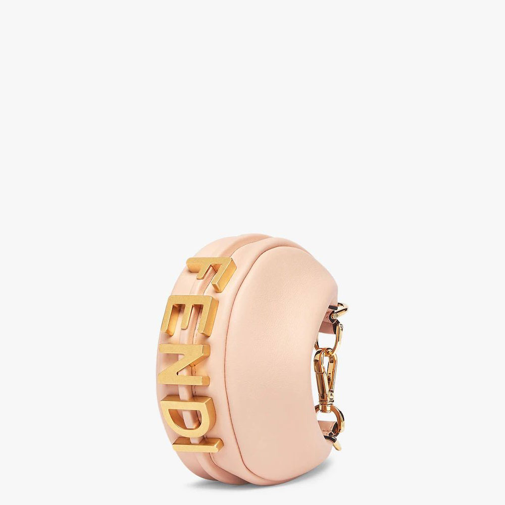 Nano Fendigraphy Hobo bag with zip fastening. embellished with vintage gold metal FENDI lettering. The adjustable strap with a clip allows it to be attached to larger bags or worn on the wrist. Comes with hooks for the shoulder strap. Made of pink leather. Gold-finish metalware. Size:W16.5 x H14 x D5cm