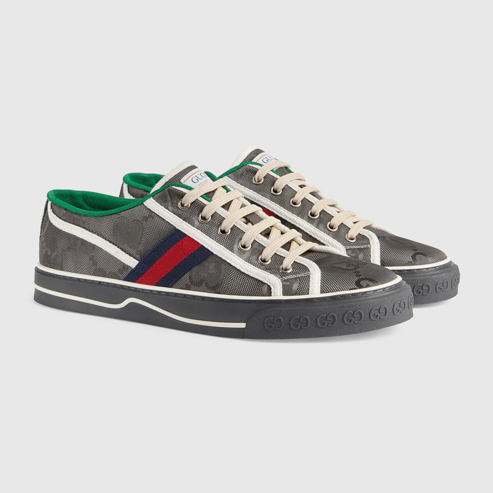 Supporting the House's commitment to sustainability. this pair of Gucci Tennis 1977 sneakers is part of a line of accessories and ready-to-wear made from recycled materials and trims. Gucci Off The Grid is the first collection from Gucci Circular Linesa concept created to support the House's vision for circular production. Designed for those mindful of their environmental impact. Gucci Off The Grid uses recycled. organic. bio-based and sustainably sourced materials.