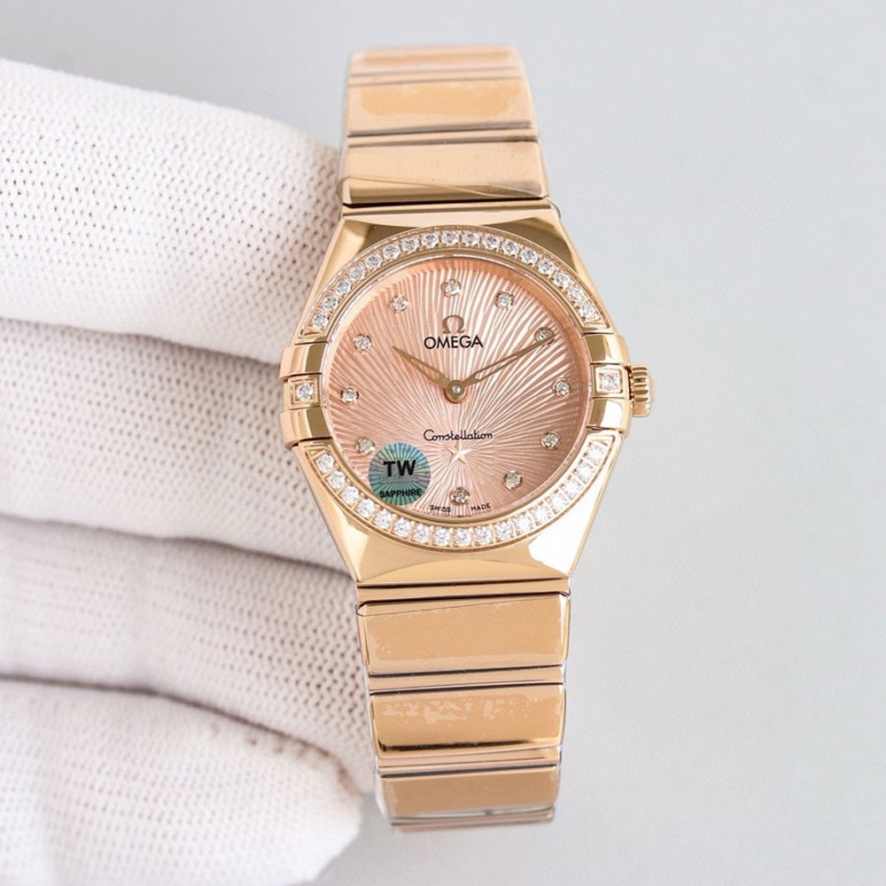 The Omega Constellation 131.55.28.60.60.001 in 18K rose gold is a sophisticated timepiece perfect for elegant women's fashion. With its vintage-inspired 28mm case resembling classic Omega Geneve gold watches, it pairs beautifully with neutral-toned outfits.