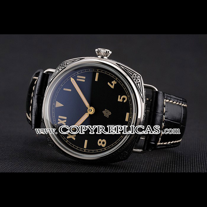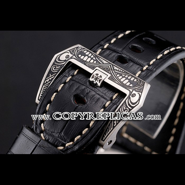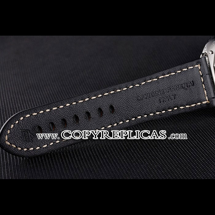 Bracelet : Officine Panerai Italy heat embossed black crocodile leather strap with white thread stitching and intricately carved brushed stainless steel hook-buckle clasp