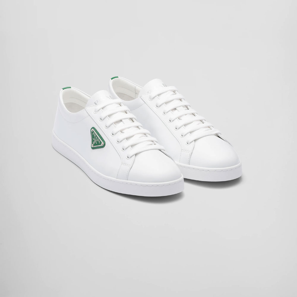 Since the '90s. brushed leather. traditionally used in fine classic footwear. has been reinterpreted in Prada collections on contemporary designs like these sneakers with a sleek line: the result is a hybrid style that reflects the duality of the brand. The enameled metal triangle logo decorates the shoe.