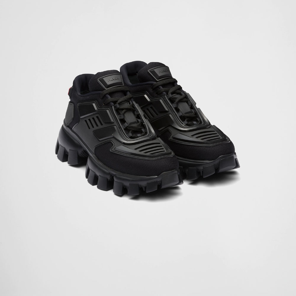 The unusual three-dimensional effect of the upper created by the injected rubber eyestay element characterizes the Prada Cloudbust Thunder sneakers in technical fabric and rubber with intricate volumes and sawtooth tread.