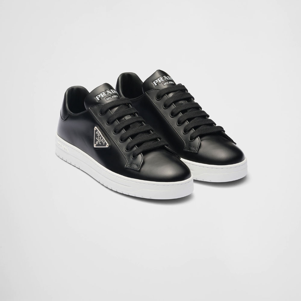 Prada's iconic triangle logo decorates the upper of these soft leather sneakers with a sporty style that is classic yet sophisticated. Traditionally used in classic fine footwear. since the 90s brushed leather has been reinterpreted in Prada collections on unexpected designs. for a hybrid result that reflects the duality of the brand.