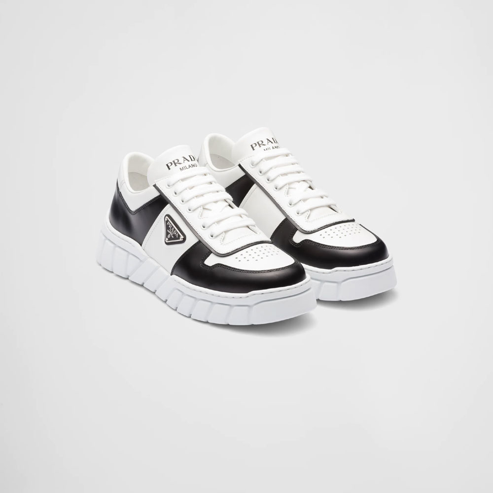 These luxury leather sneakers are defined by a modern design. Voluminous rubber soles provide a sporty allure. while an iconic. enameled-metal triangle logo completes the look.