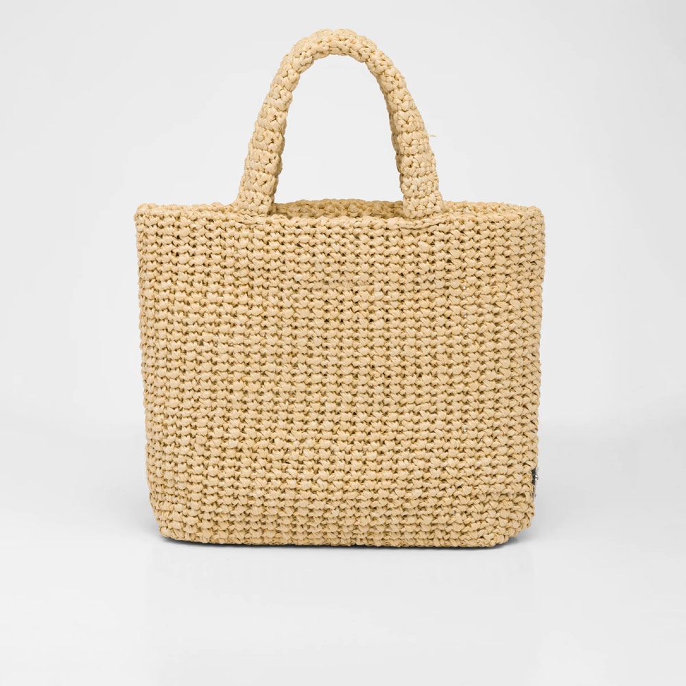 This tote bag with a soft. deconstructed design is made of raffia. a light material of natural origin with a summery mood. The embroidered lettering logo adorns the front. while the emblematic enameled metal triangle logo decorates the side.