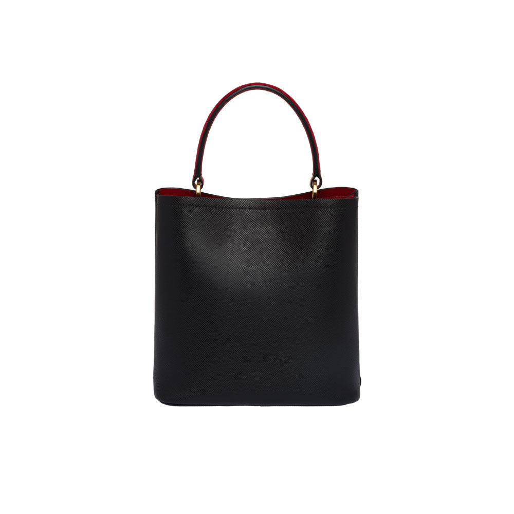 The elegant design of the Prada Panier bag in Saffiano leather is enriched by contrasting crocodile leather details echoing the color of the nappa leather interior. The bag has a detachable shoulder strap and an exclusive leather name tag.