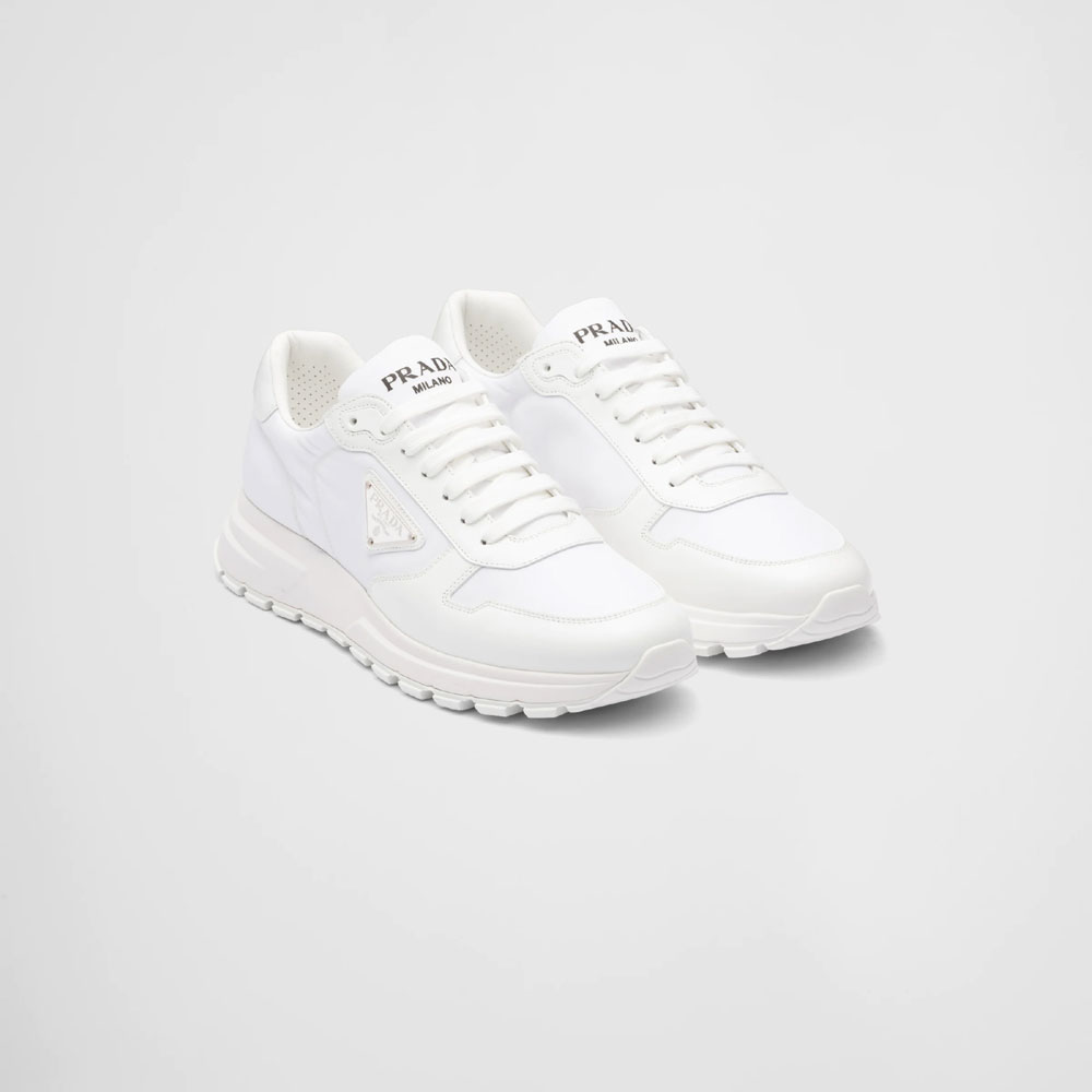 PRAX 01 sneakers combine an elegant yet innovative design with technical materials typical of Prada collections. This shoe is made of Re-Nylon. an innovative material produced from recycled plastic materials collected in the ocean. and brushed leather. The triangle logo. imbued with a new sporty spirit. stands out on the side. while the chunky rubber tread sole gives the silhouette hybrid allure.