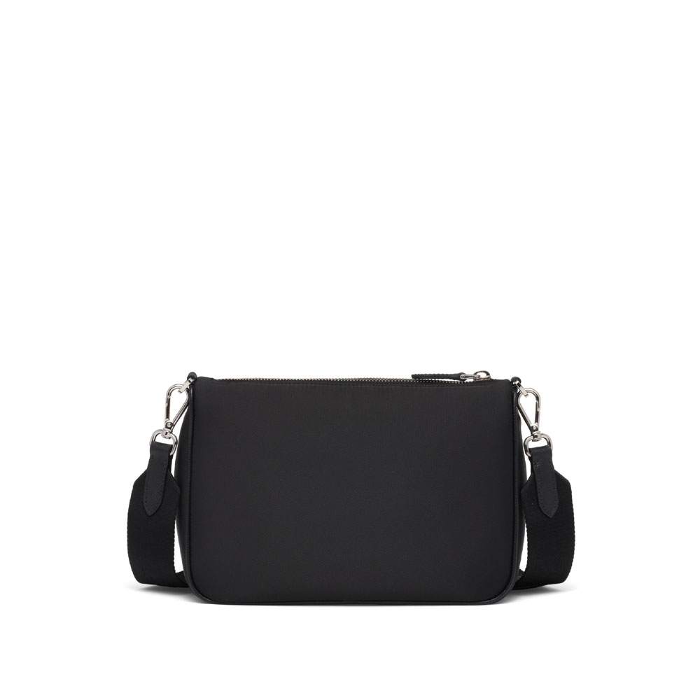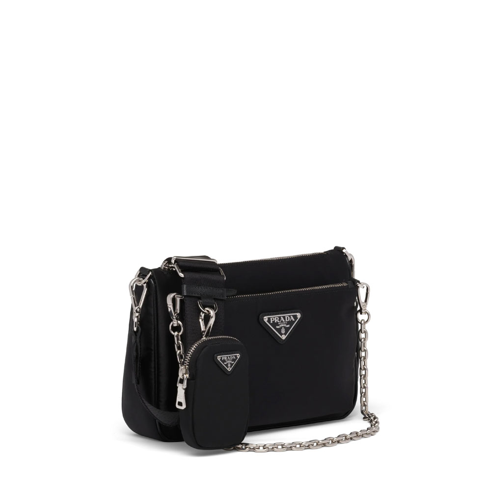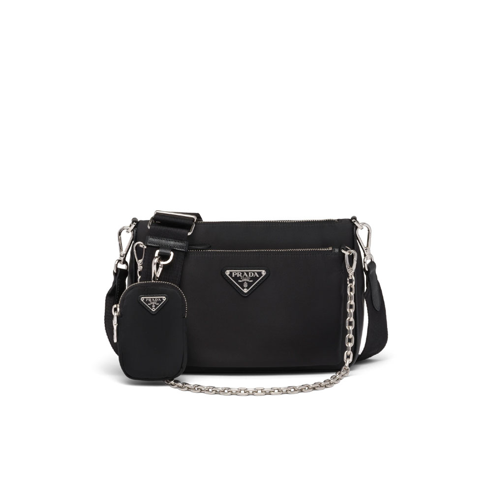 Saffiano leather details add an iconic touch to this shoulder bag made of Re-Nylon. a distinctive fabric of the brand produced from recycled. purified plastic materials collected in the ocean. fishing nets. and textile fibers. Its removable details are distinctive: The logo-print shoulder strap and front pocket with chain that turns into a pouch. The accessory is embellished with the enameled metal triangle logo.