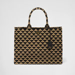 Introduced for the first time on trunks designed by Mario Prada. the Prada triangle expresses uniqueness and modernity through its universal. minimalist shape that is reinvented in a different way each season. Here. the geometric design is transformed into a sophisticated yet modernist pattern that plays with contrasting colors and decorates this sleek tote bag. Details in the brand's iconic Saffiano leather embellish the design.