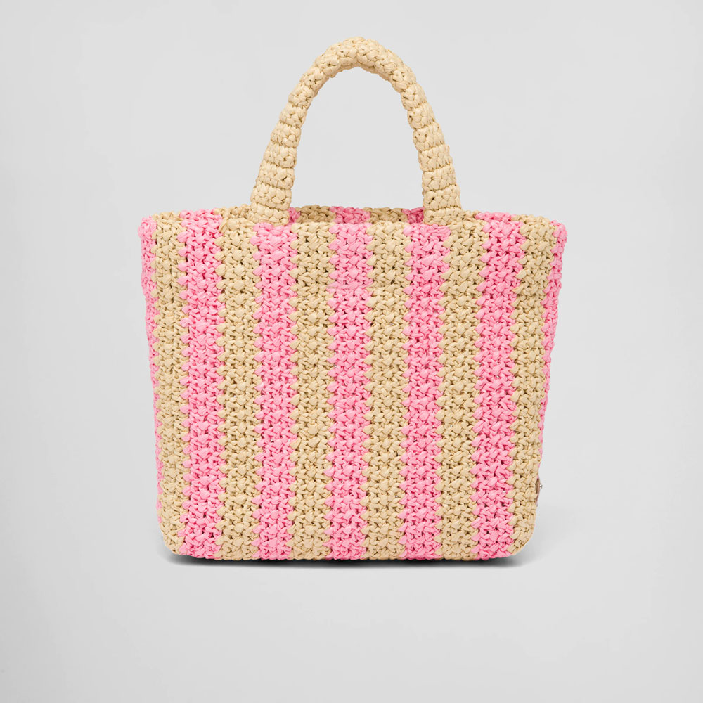 This tote bag with a soft. deconstructed design is made of raffia. a light material of natural origin with a summery mood. The embroidered lettering logo adorns the front. while the emblematic enameled metal triangle logo decorates the side.