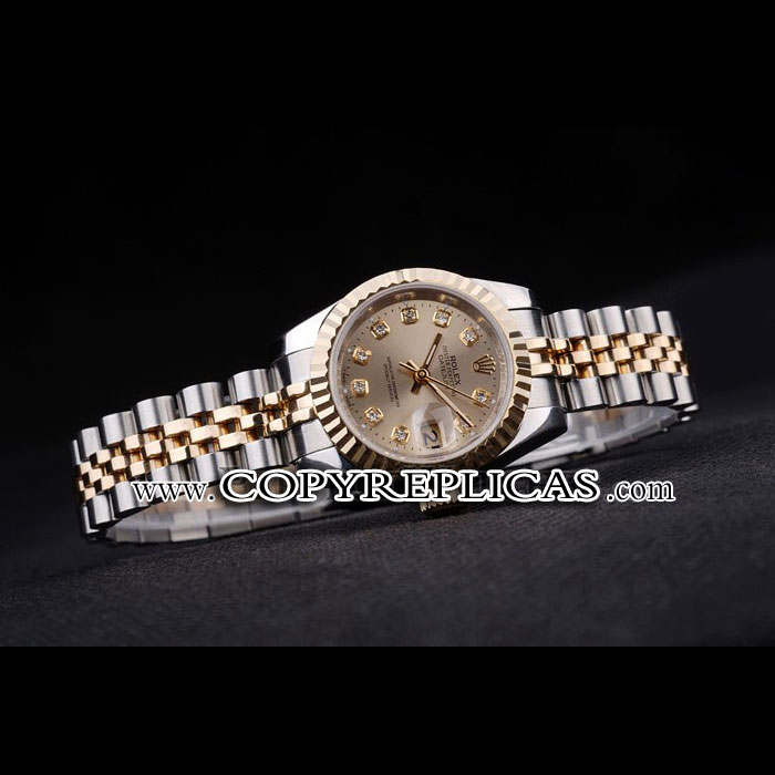 Movement : Kinetic (Automatic) Quality : Japanese Miyota Case : Polished stainless steel case Back : Stainless steel push-in case back with green Rolex logo stamp Bezel : 18k yellow gold plated stainless steel cutwork bezel Crown : 18k yellow gold plated steel cutwork crown with Rolex logo Bracelet : Two toned link bracelet in polished stainless steel and 18k yellow gold plated steel with Rolex engraving hidden clasp displaying the Rolex logo Band Type : Stainless Steel Watch Clasp : Flip Clasp Glass : Sapphire Crystal Color : Two-Toned Dial Color : Gold Gender : Women Diameter : 34 x 26 mm Bracelet Length : 190 x 13 mm Case Thickness : 13 mm Shipping Size : Small