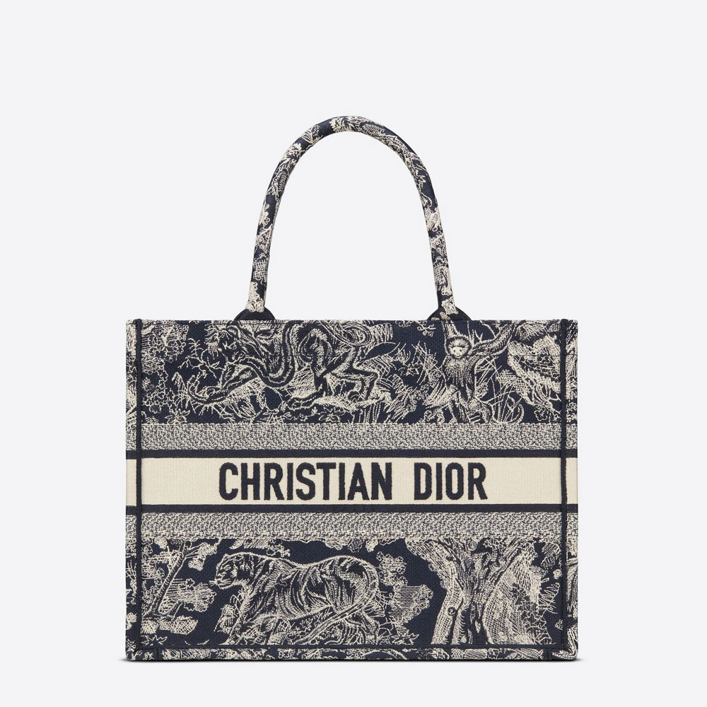 Introduced by Maria Grazia Chiuri, Creative Director of Christian Dior, the Dior Book Tote has become a staple of the Dior aesthetic. Designed to hold all small daily essentials, the style has been fully embroidered with a blue Toile de Jouy Reverse motif, a variation of the Houses hallmark pattern with a play on reversed colors. Adorned with the CHRISTIAN DIOR signature on the front, the small tote exemplifies the Houses signature savoir-faire and may be carried by hand or worn over the shoulder.