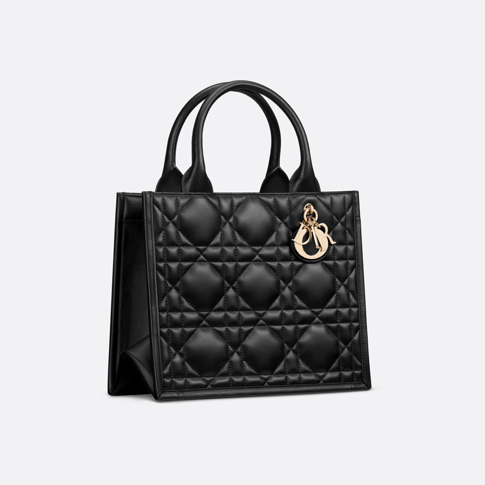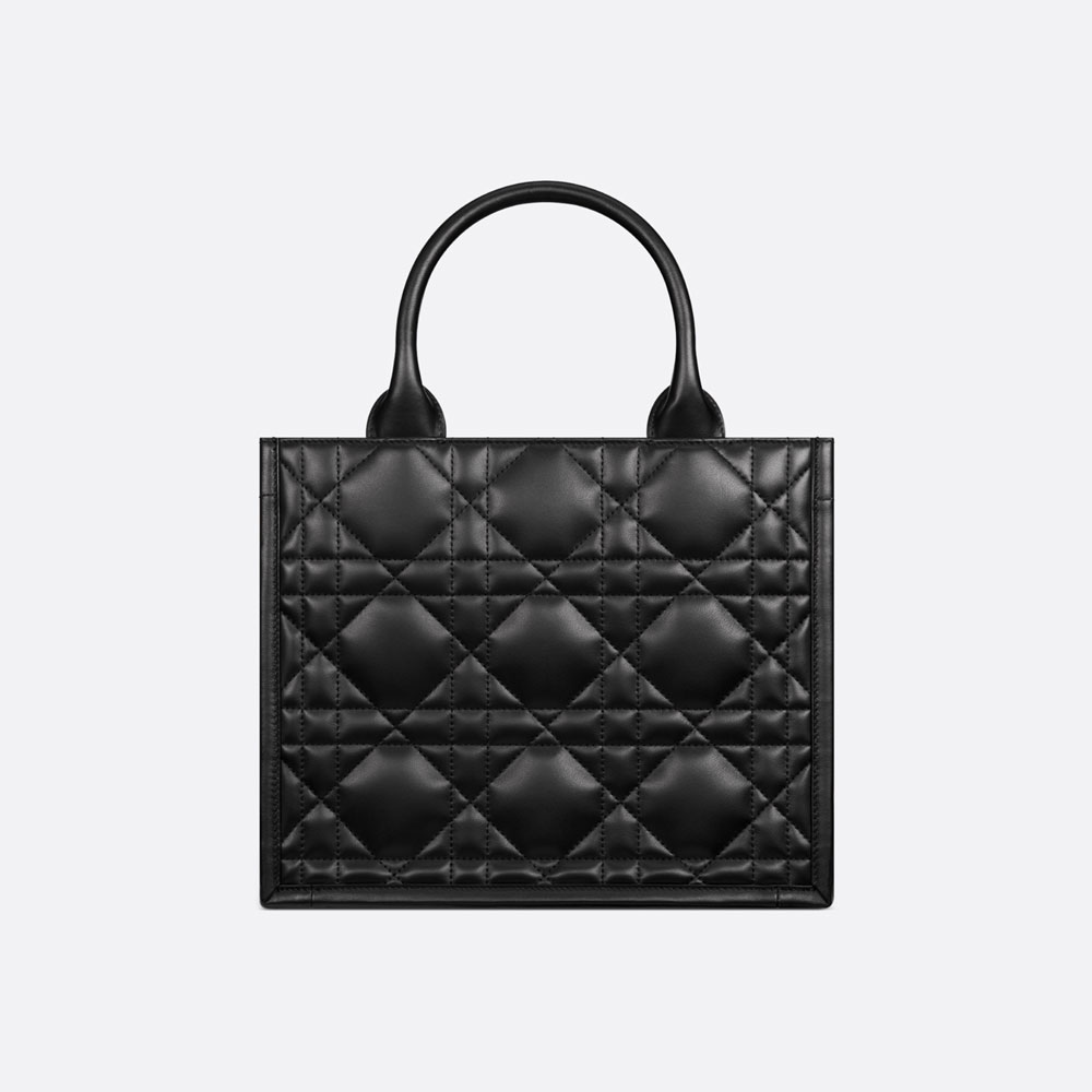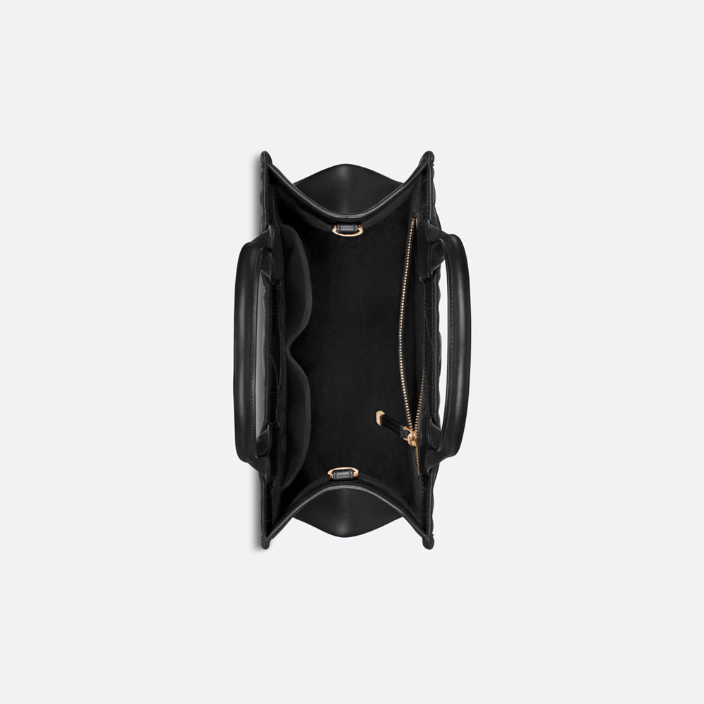Maria Grazia Chiuri's hallmark Dior Book Tote offers an original take on elegance. Crafted in black calfskin, the design showcases the Macrocannage motif and is embellished with pale gold-finish metal D.I.O.R charms on one of the handles. The cashmere leather interior reveals a zip pocket and patch pockets, ideal for organizing all the daily essentials. Featuring an adjustable and removable strap, the lightweight and practical small tote is a prime example of Dior savoir-faire and may be carried by hand or worn over the shoulder.