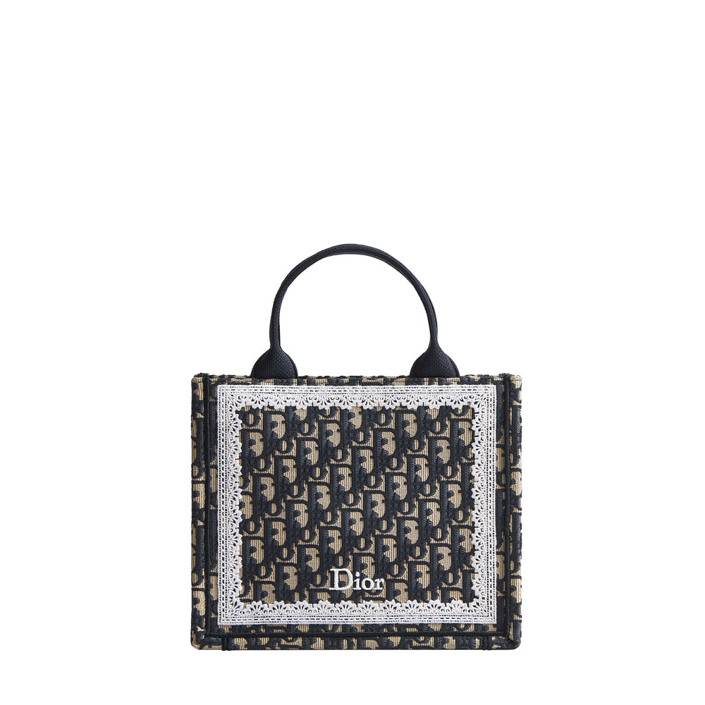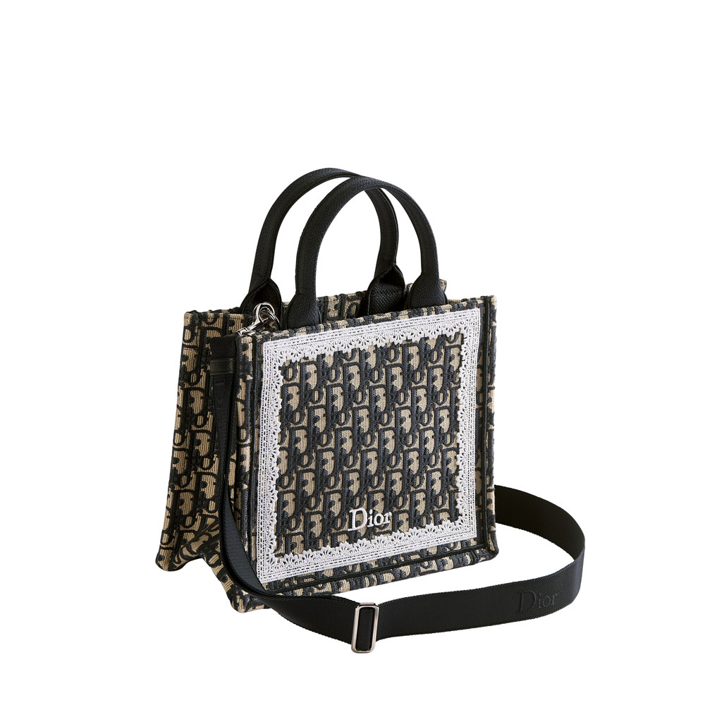 This chic small tote features the iconic Dior Oblique embroidery, elegantly framed with lace detailing for a contemporary luxury look.