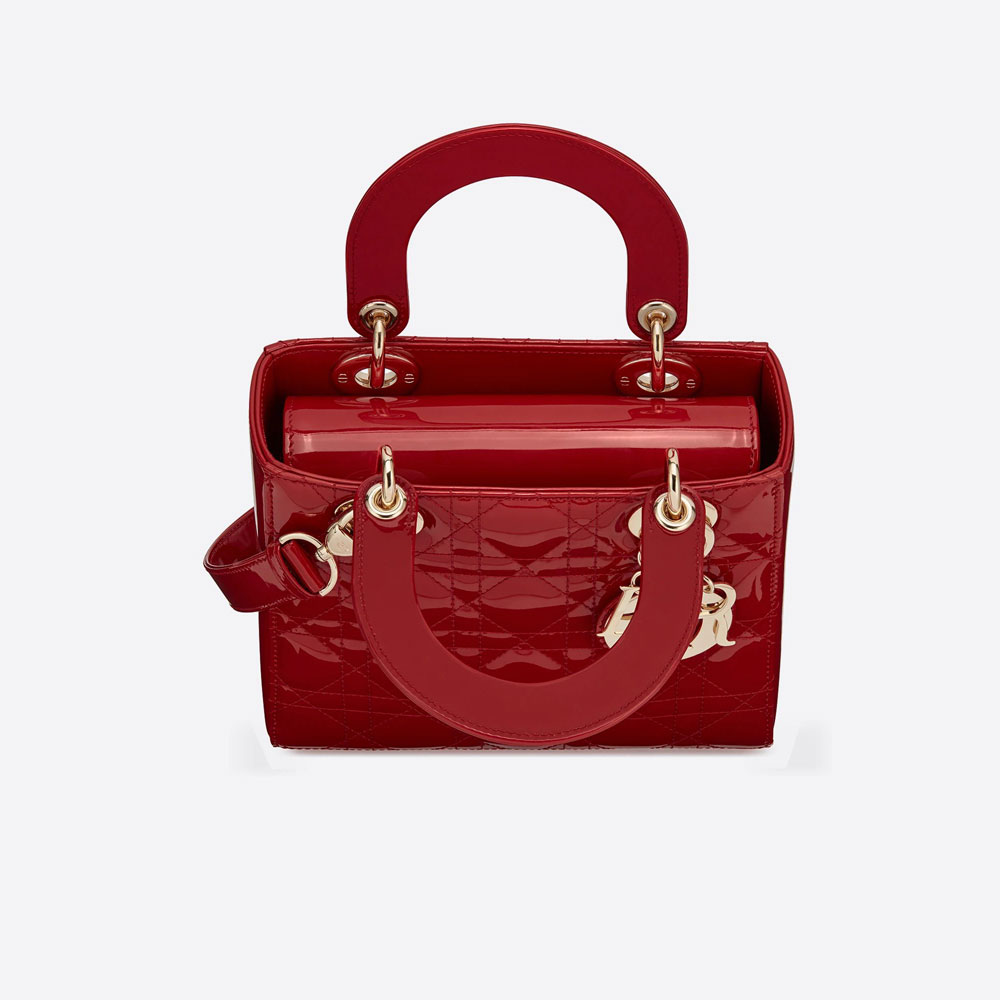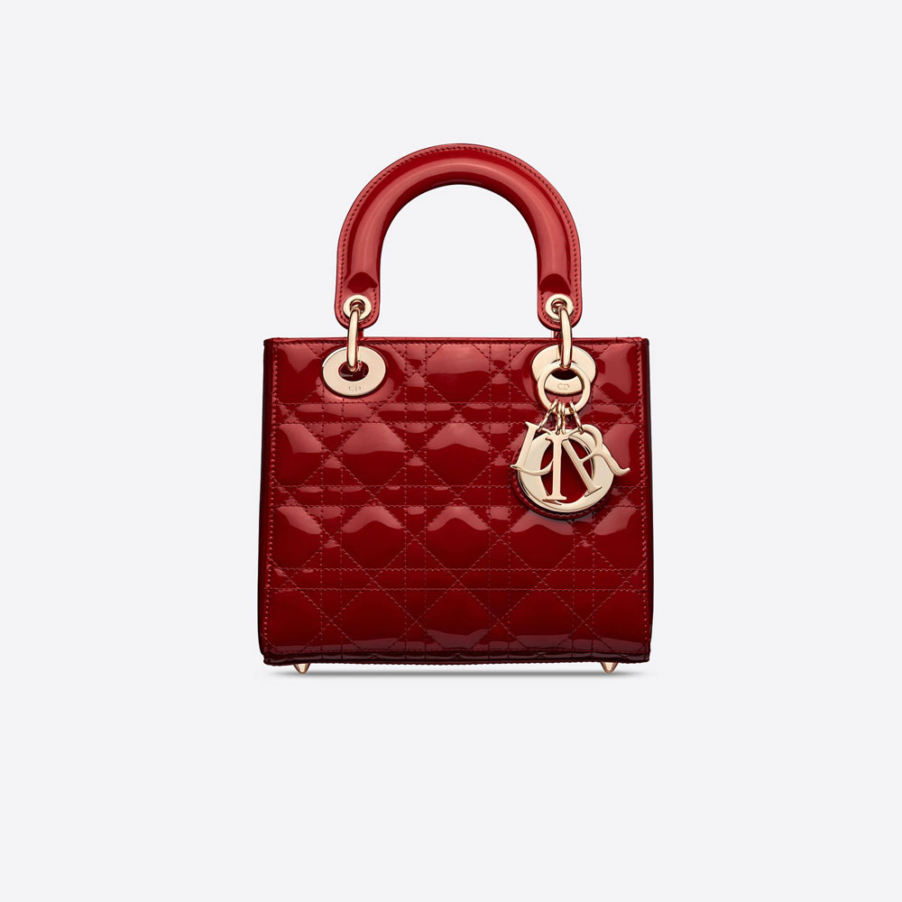 The Lady Dior handbag epitomizes the House's vision of elegance and beauty. Sleek and refined. the timeless style is crafted in bright red patent calfskin with Cannage stitching. creating the instantly recognizable quilted texture. The pale gold-finish metal signature 'D.I.O.R.' charms embellish and illuminate its silhouette. Featuring a thin. removable leather shoulder strap. the small Lady Dior bag can be carried by hand or worn crossbody.