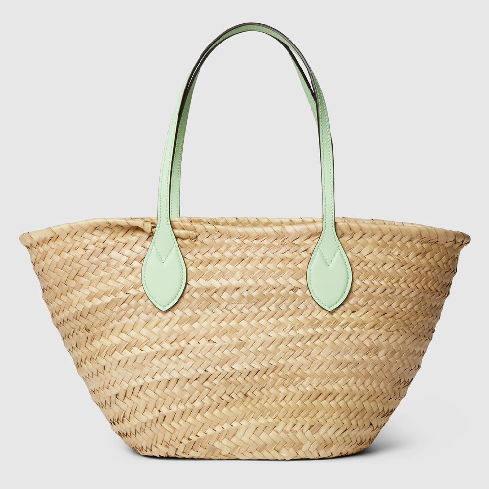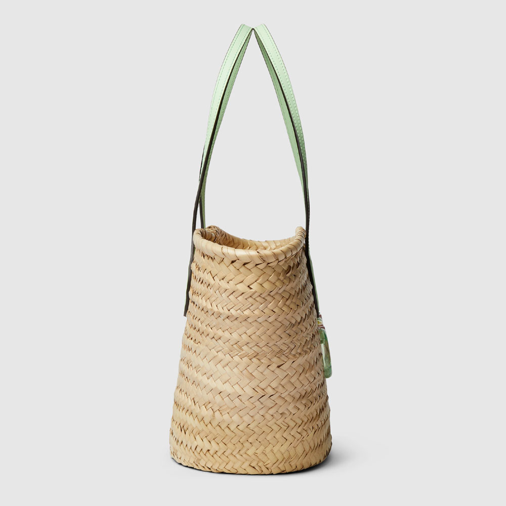Inspired by the summer spirit and beach clubs on the Italian coast, this item is part of Gucci Lido. The House's straw accessories shed new light on the traditional material in vibrant colors and iconic motifs. This small tote bag features pale green leather straps across a natural base. The name of the House appears as a multicolored Plexiglas logo detail in keeping with the warm weather feel.