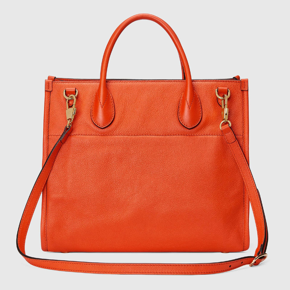 Subtle logo touches add a minimalist feel to classic shapes and silhouettes. Here. this orange leather tote bag is defined by an embossed version of the Gucci logo.