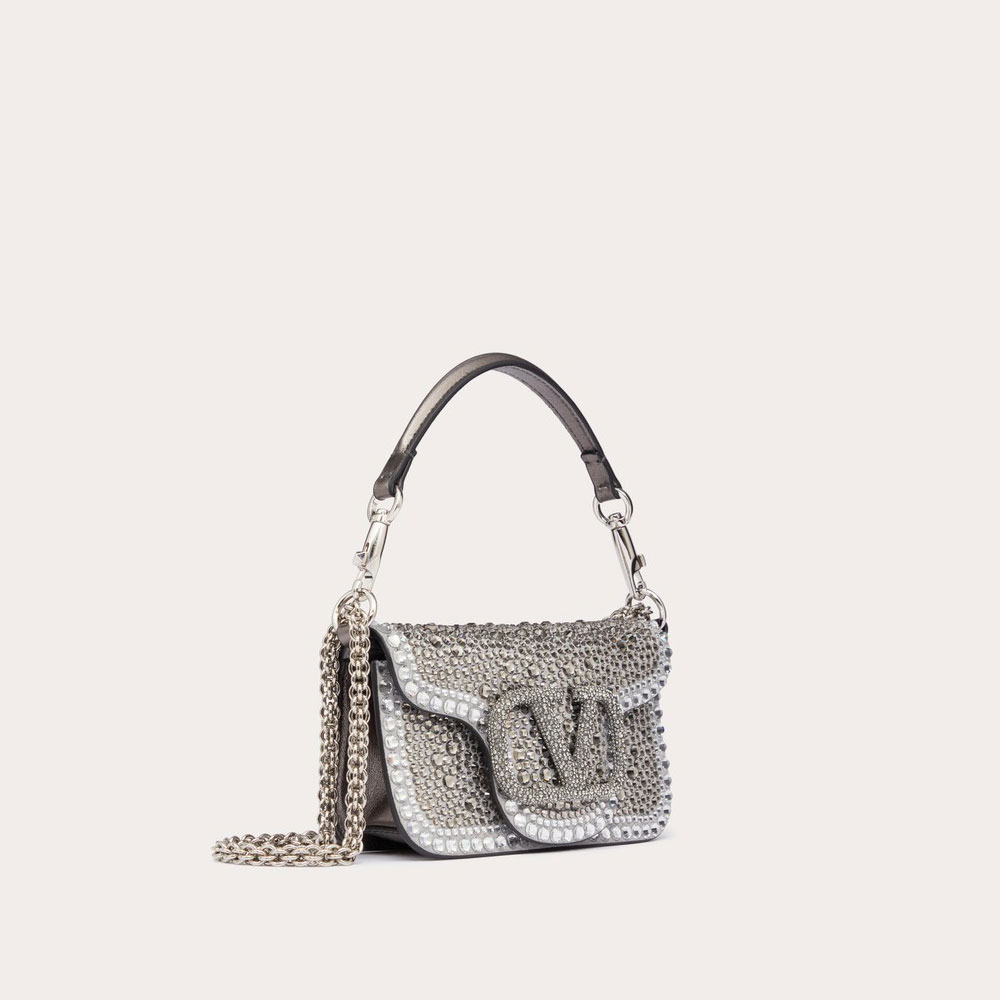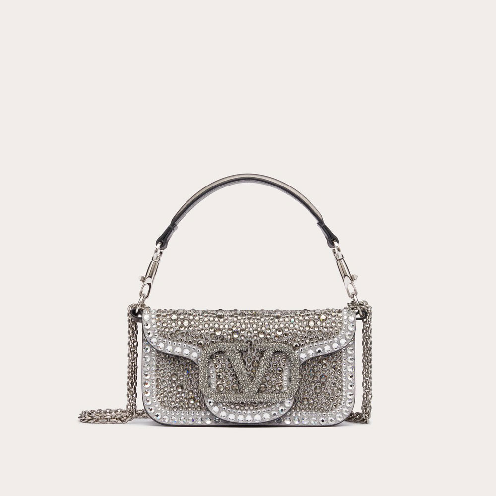 Valentino Garavani Loco small shoulder bag with rhinestone applique and Swarovski covered Vlogo Signature element. Equipped with both a detachable sliding chain strap and a detachable handle, this accessory can be worn as a crossbody/shoulder bag or carried as a handbag.