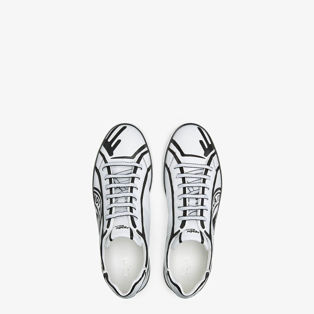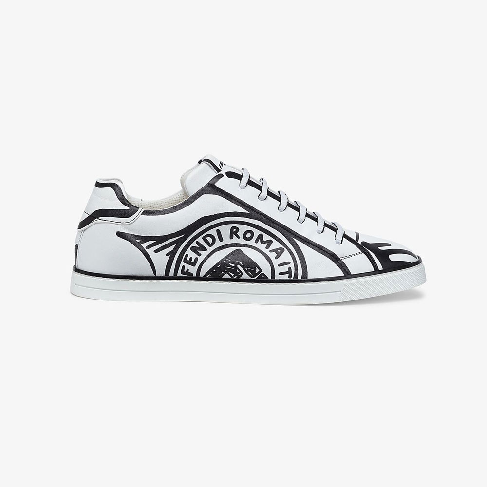 White leather lace-up sneakers. The edges and details are marked by a contrasting graphic outline that creates a two-dimensional effect. Black Fendi Stamp detail.